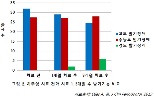 2013년 터키 이노누대학 연구팀은 중등도 내지 심한 발기부전을 동반한 만성 치주염환자 120명을 치주염을 치료한 60명과 치료하지 않은 60명(대조군)으로 나누어 비교한 결과, 3개월 치료한 환자들은 치료하지 않은 환자들에 비해 발기기능이 의미 있게 개선된 것을 발견했다 (그림 2). <②편에 계속>