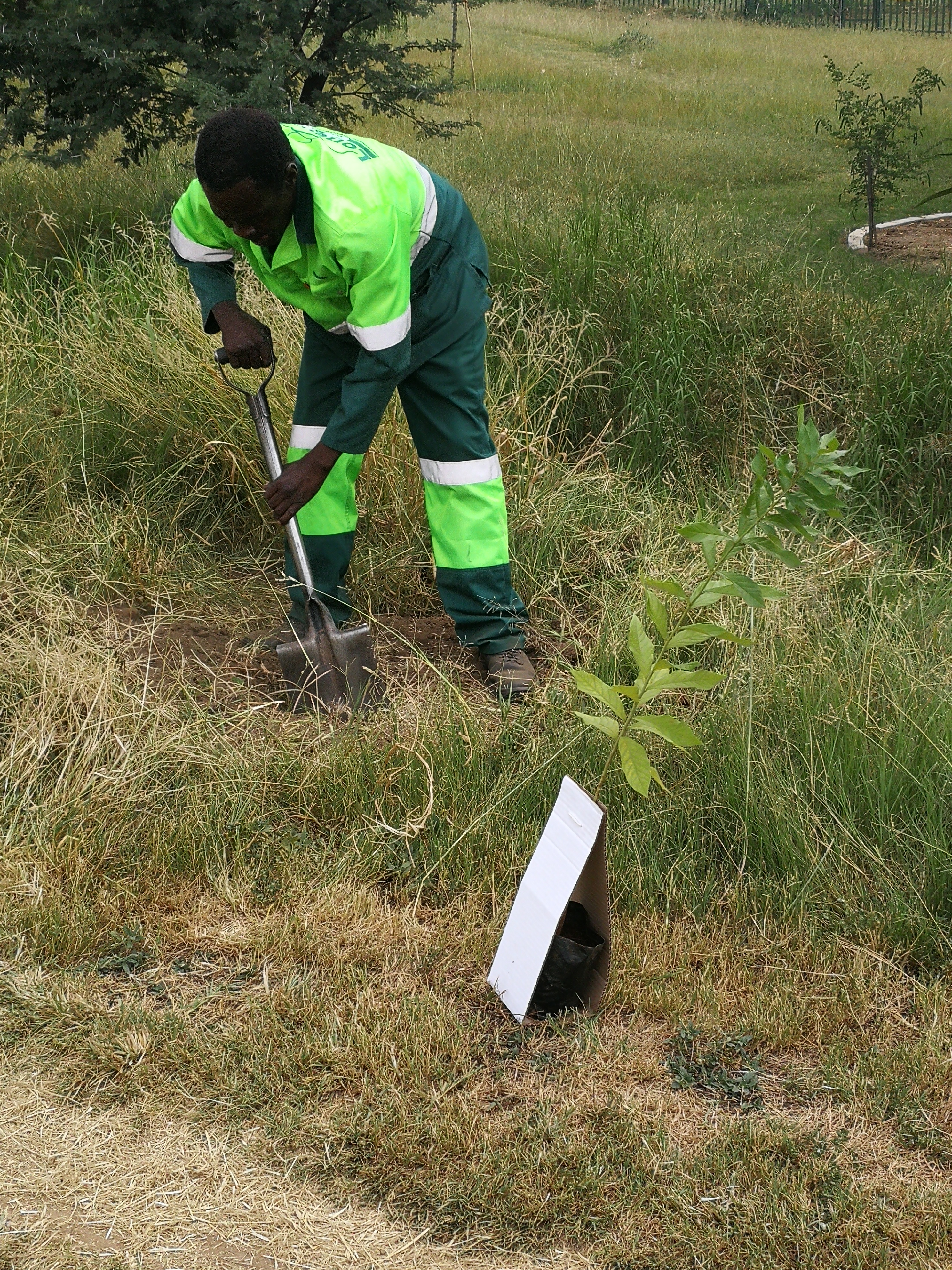 Our local residents association estate management team kindly assisted with planting the tree next to a small spruit (stream) and near other trees, particularly near another combretum. (You can see the other combretum's trunk on the other side of the spruit behind me.)
