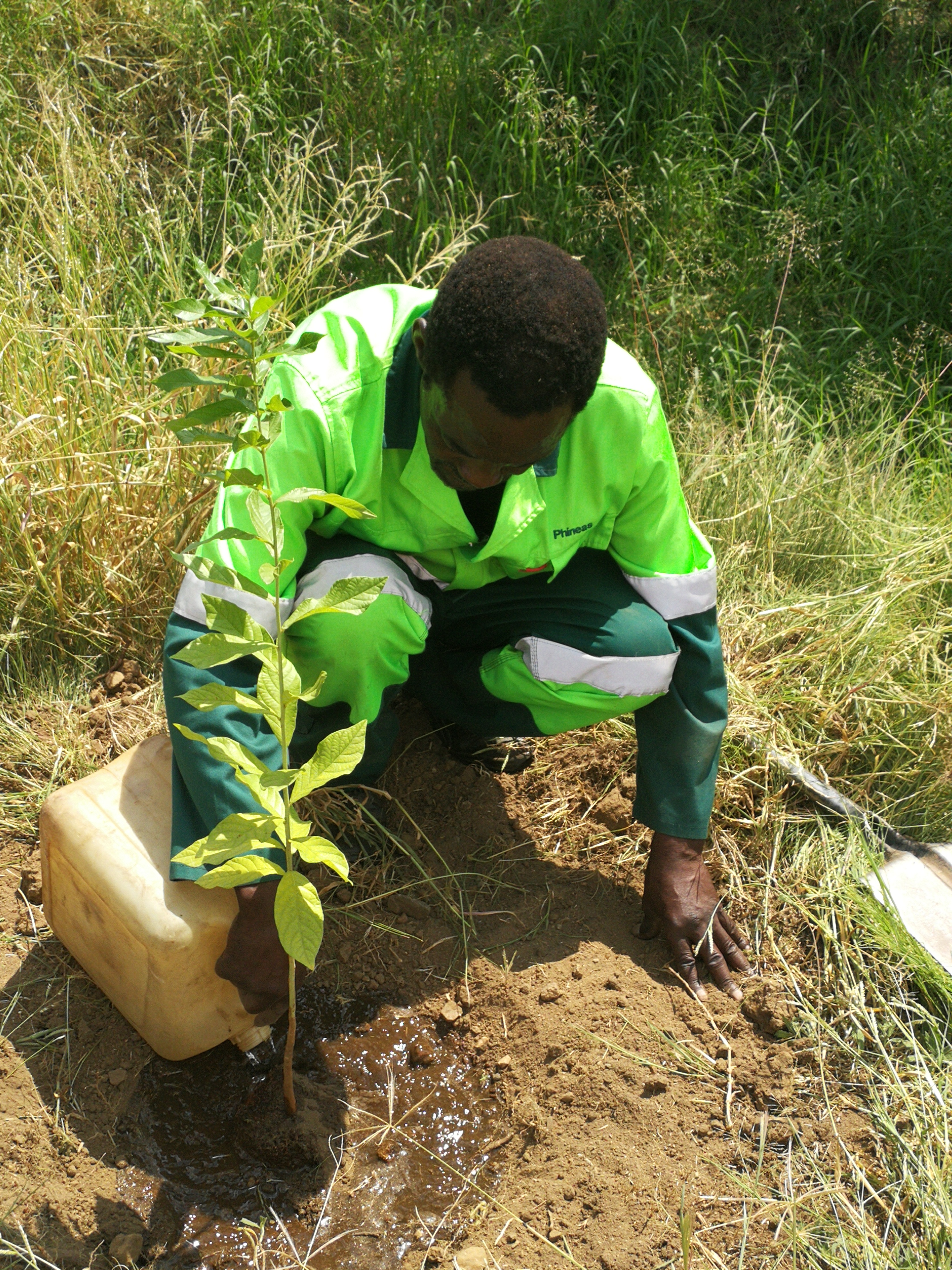 He's staked tall and ready to face the unknown now. We've been by to visit and water him a few times now, and I'm sure he can hardly wait for Gustav and Elsie to see him in his new habitat. We hope he grows big and strong and offers shade to passersby, flowers for the birds and insects and company for the combretum across the spruit.