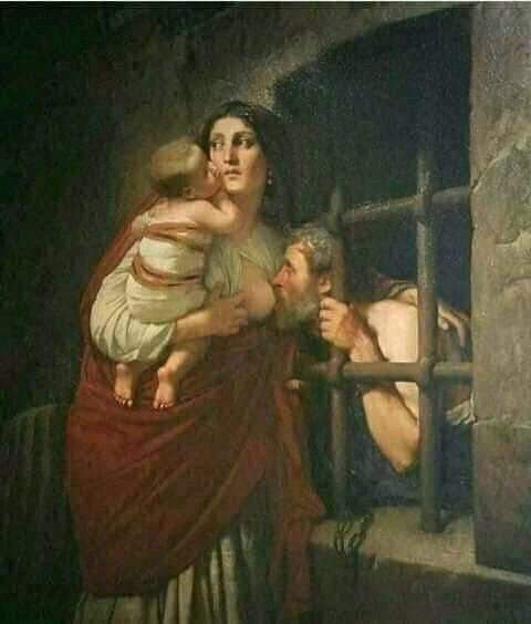 আর শাস্তিটা ছিল এমন যে যতদিন না ওনার মৃত্যু হয় ততদিন ওনাকে কোনো কিছু না খেয়েই থাকতে হবে । এরকম শাস্তি আগে বহু লোককেই দেওয়া হয় এবং তাদের মধ্যে বেশিরভাগই ছিল সবাই বৃদ্ধ। এমত অবস্থায় ওনার কন্যা ওনার সাথে প্রতিদিন দেখা করার জন্য সরকারের কাছে অনুরোধ করল এবং সরকার তাকে অনুমতিও দিলেন কিন্তু শর্ত ছিল যে উনি ওনার বাবার জন্য কোনোরকম খাওয়ার বা বাইরের অন্যকোনো কিছু নিয়ে যেতে পারবেন না। প্রতিদিন দেখা করার আগে ওনাকে ভালো করে পরীক্ষা করে নেওয়া হতো যাতে উনি ওনার বাবার জন্য কোনো রকমের খাবার বা অন্য কোনো জিনিসপত্র নিয়ে প্রবেশ করতে না পারেন । কিন্তু বাবার এ হেন অবস্থা মেয়েটি প্রতিদিন আর দেখতে পারছিলেন না । তাই নিজের বাবাকে বাঁচানোর জন্য নিরুপায় হয়ে নিজের বুকের দুধ পান করাতে বাধ্য হন । আর এদিকে যখন কিছুদিন যাবার পরও ঐ লোকটির মৃত্যু হলোনা তখন প্রহরীদের সন্দেহ বাড়তে লাগলো এবং বাবাকে নিজের দুধ খাওয়ানো অবস্থায় মেয়েটিকে ধরে ফেলল। এই বিষয়ের উপর আবার মামলা মোকদ্দমা শুরু হলো । তখন সরকার আইন কানুনের জায়গা থেকে সরে ভাবনার জায়গা থেকে এই বিষয়ের বিচার করলেন এবং রায়ে দুজনকেই মুক্তি দিলেন। এটা নিয়ে পৃথিবীতে বহু সিনেমা ও বই লেখা হয়েছে। তাই তো বলা হয় যে- নারী যেই রূপেই থাকুক না কেনো , তা সে "মা" , তা সে "স্ত্রী" , তা সে "বোন" আর তা সে "মেয়ে"ই হোক প্রতিটি রূপেই এরা বাৎসল্য , ত্যাগ আর মমতার মূর্তি । #কপি