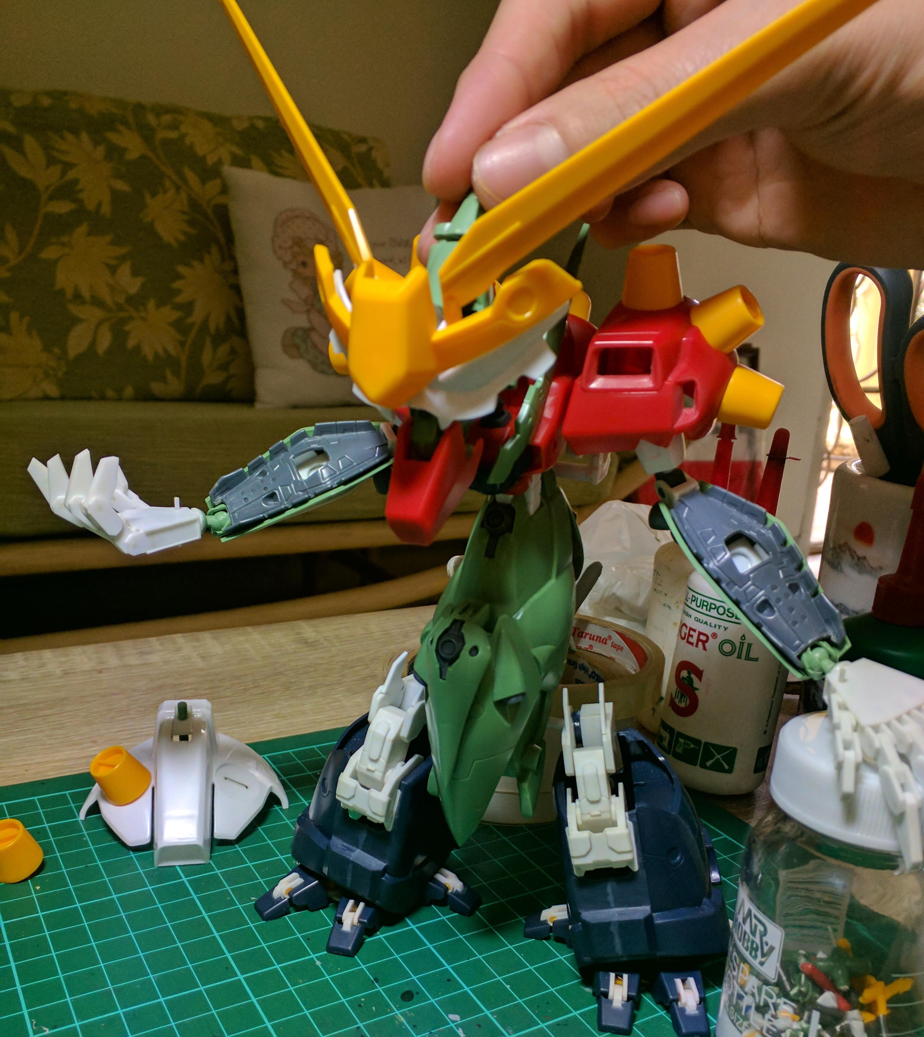 - Fixing broken peg using gunpla runer and several tools.