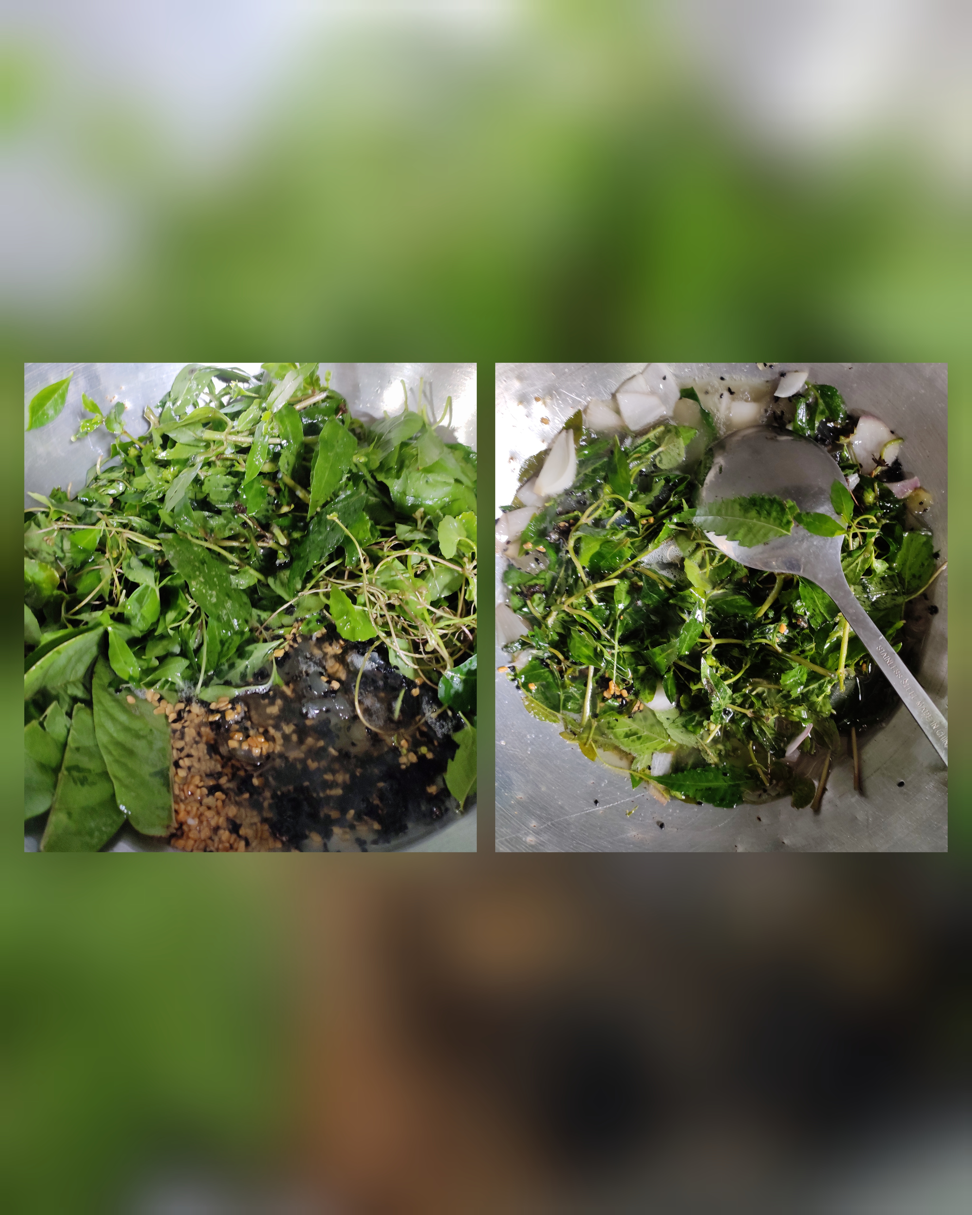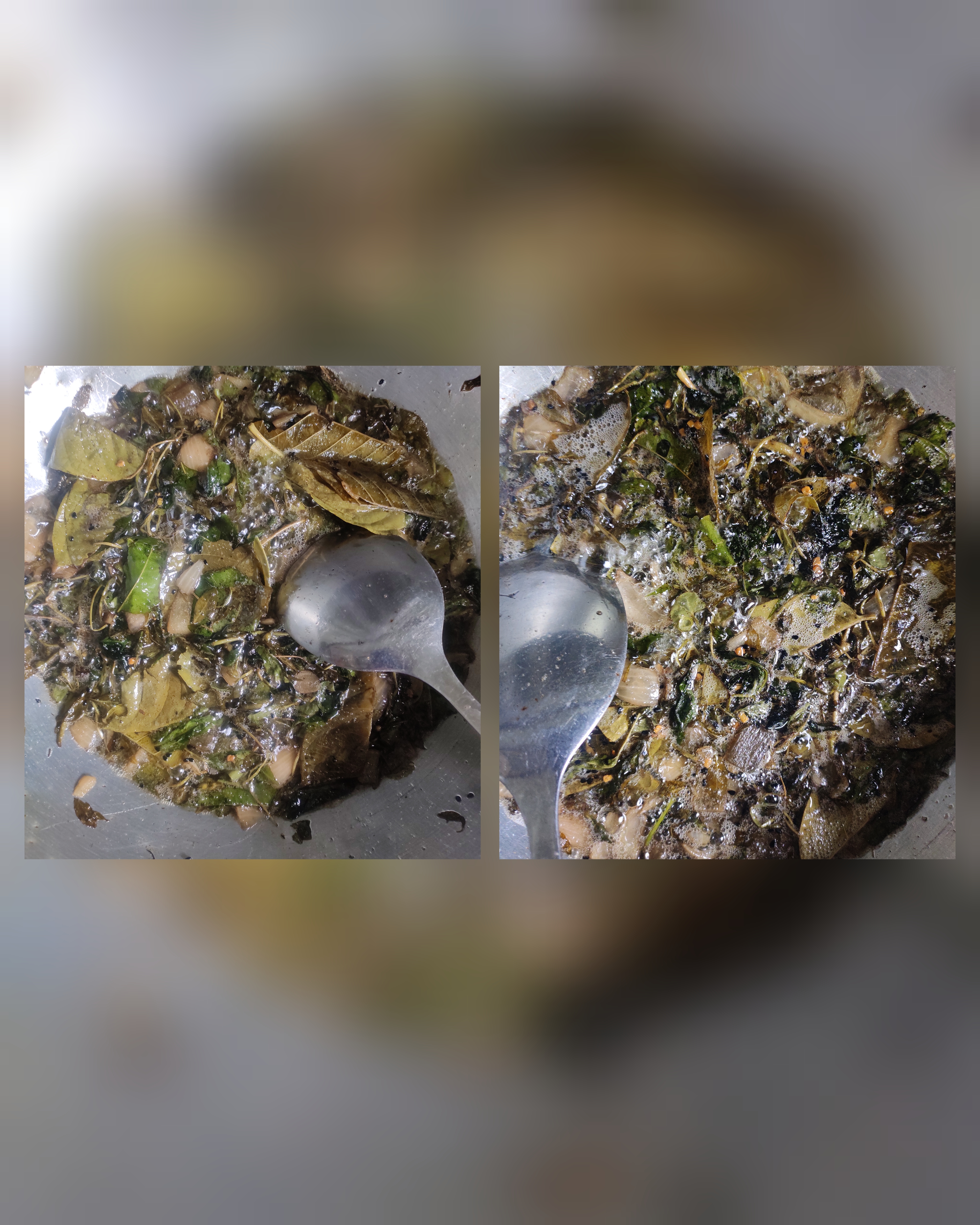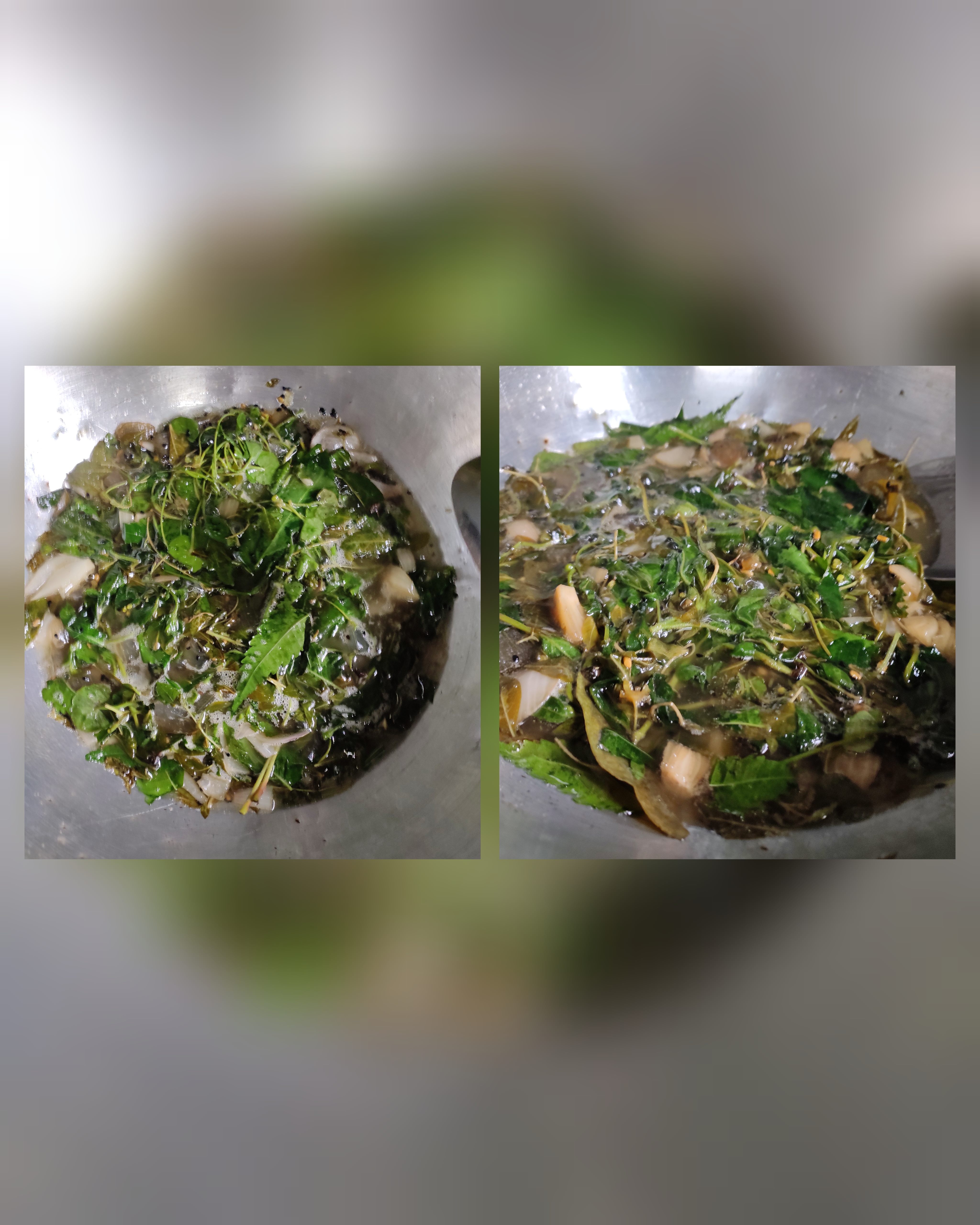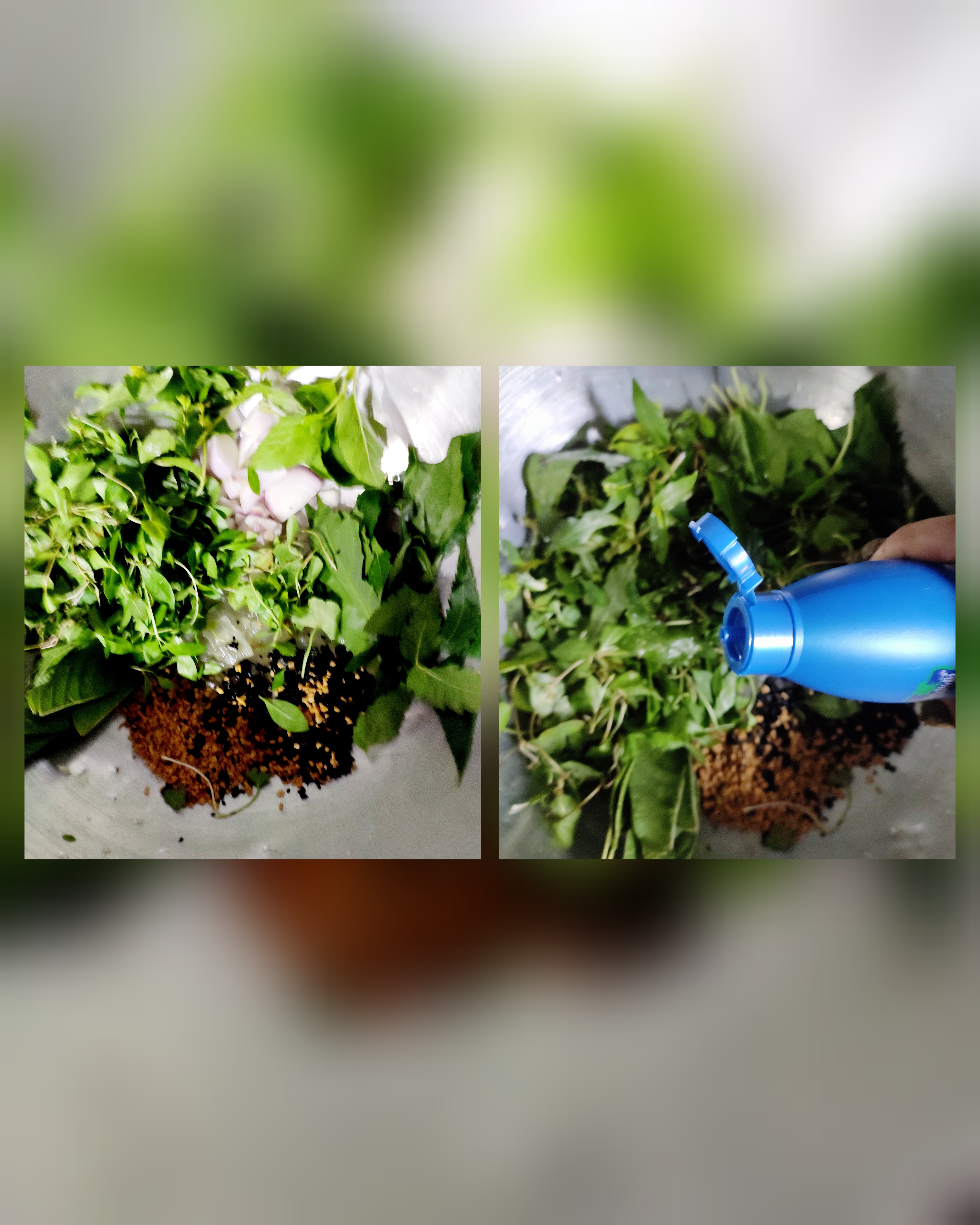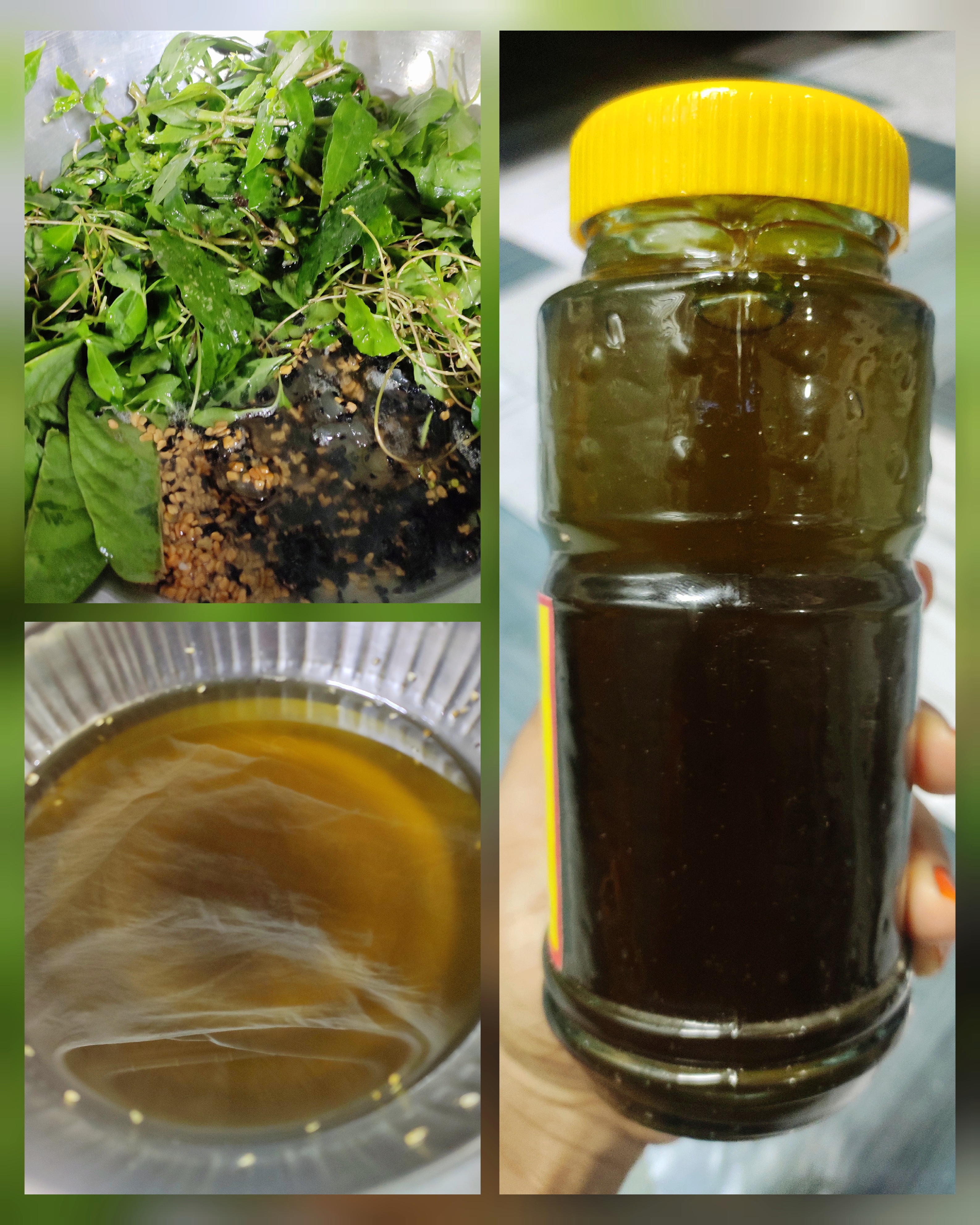 - তারপর পাতিল এর মধ্যে থানকুনি পাতা, জবা পাতা, নিম পাতা, পেয়ারা পাতা, কেশরাজ পাতা ও নারিকেলের তেল দিয়ে দিলাম।