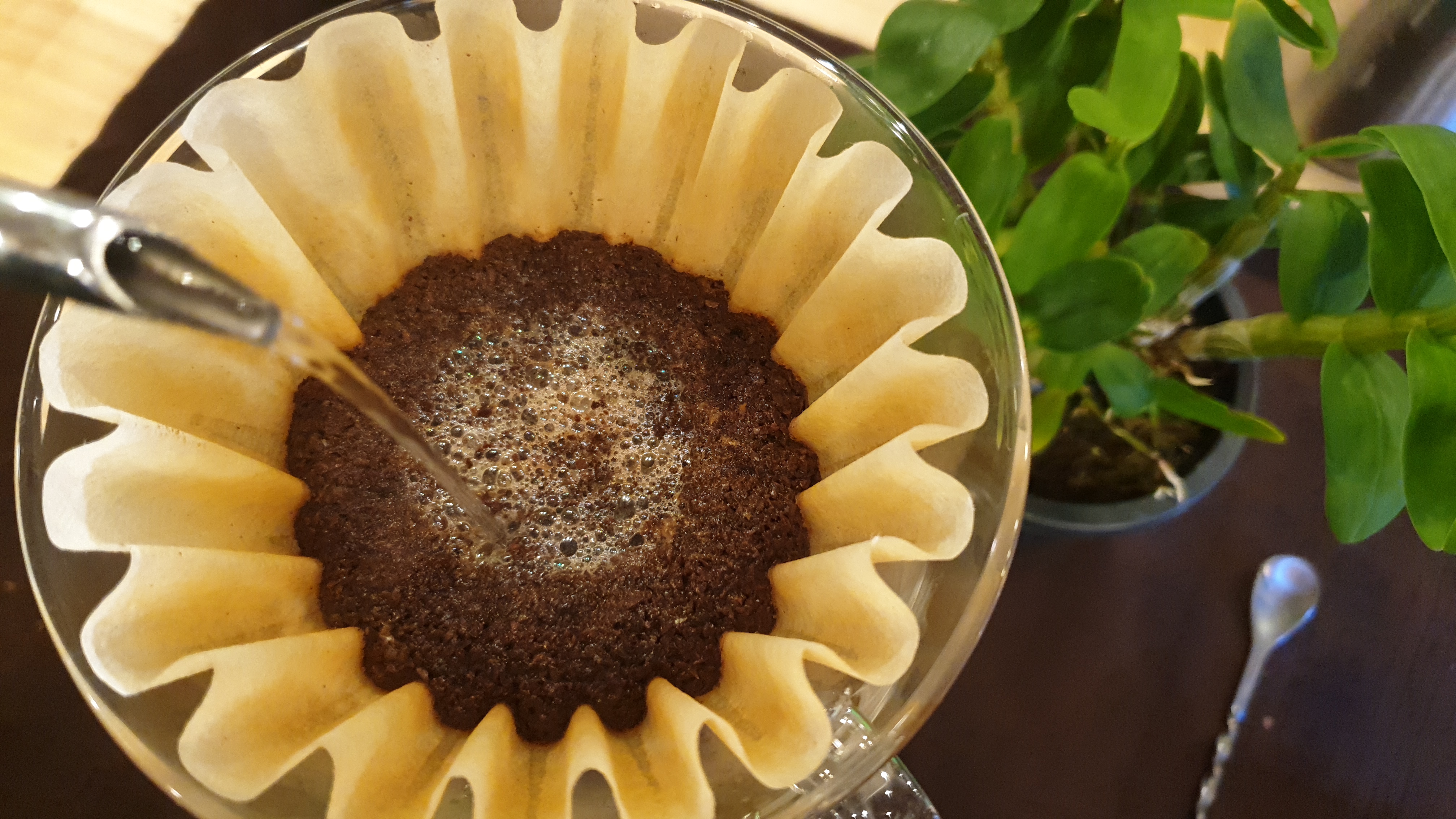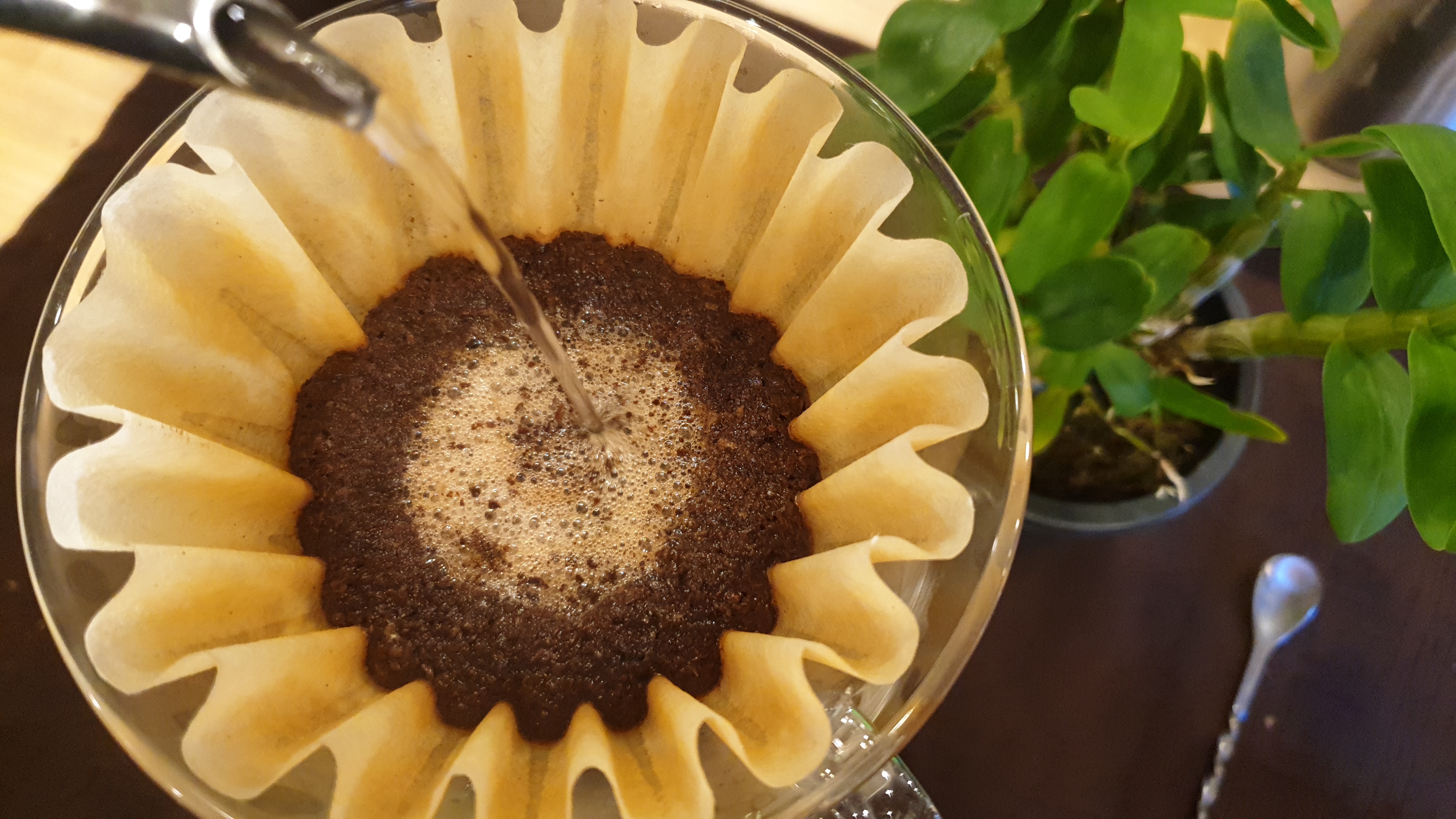 - 30~40초 후, 80ml의 물을 두번 나눠 붓는다.