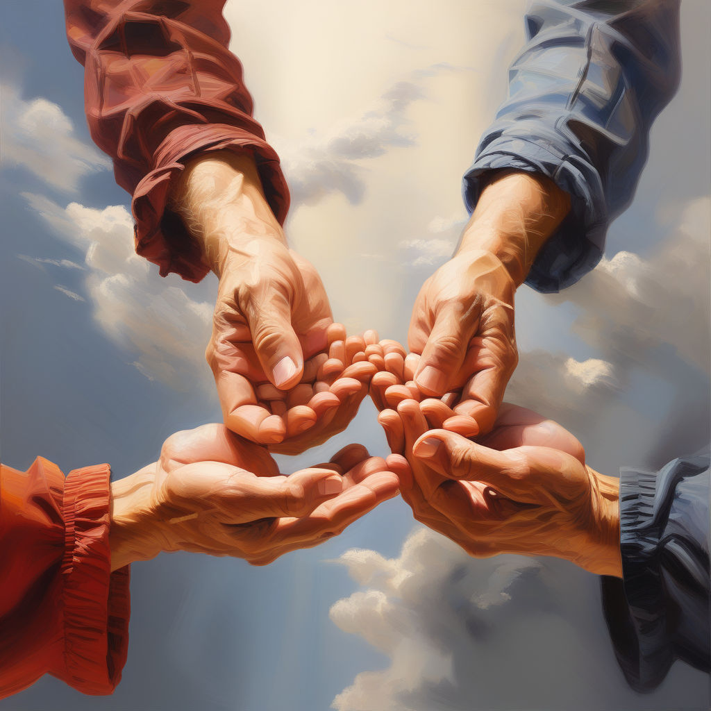 Handshalpav47 (34)in #handsofgrace • 2 years ago Three hands interlocked against a blue sky background. #nurturinghands #stronghands #gentletouch #creativehands #helpinghands #expressivehands #artisticfingers