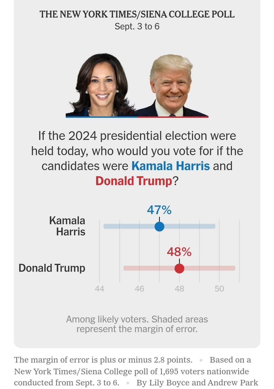 In a race this close with polls with 3% margins of error, this result is compatible with a result saying Harris +5 on sampling error alone (remember margin of error applies to each vote share separately as seen in the shaded areas in the image).