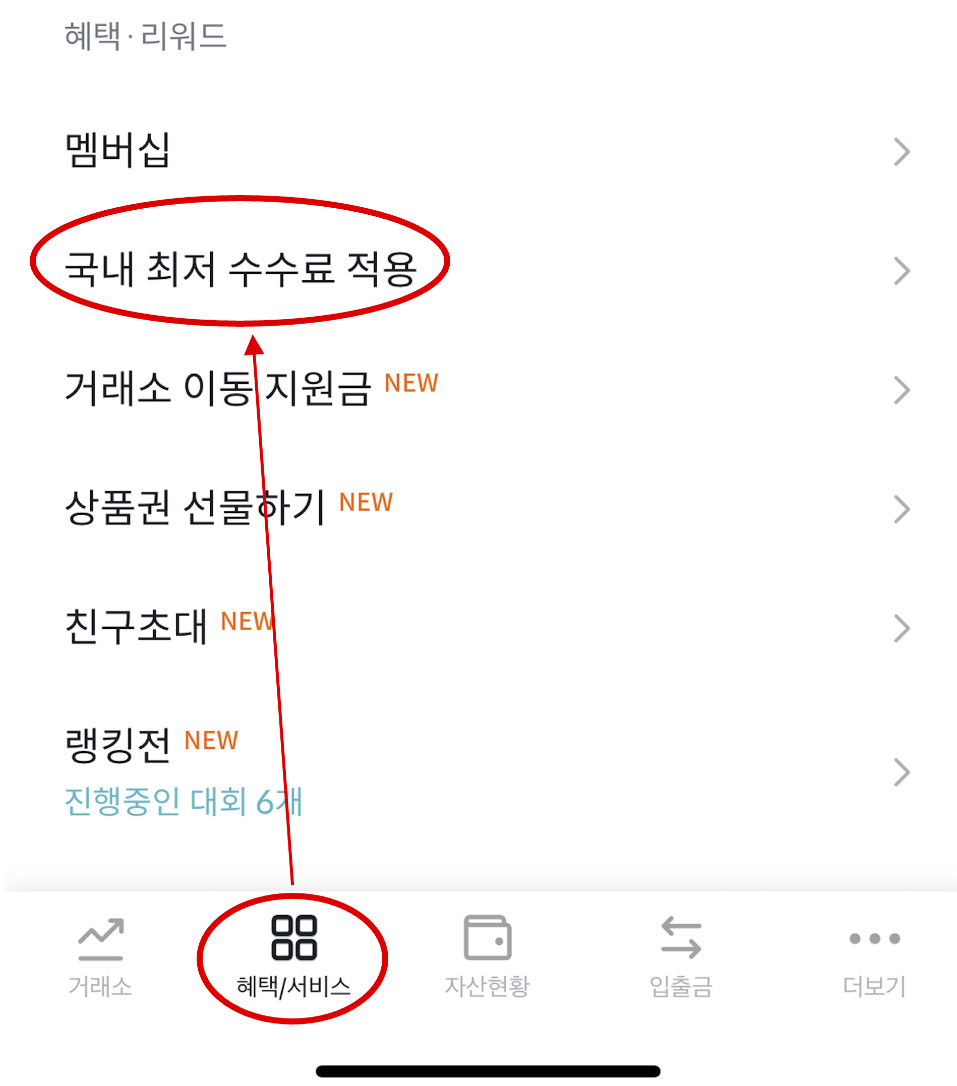하단 메뉴의 “혜택/서비스” → “국내 최저 수수료 적용” 에 있습니다.