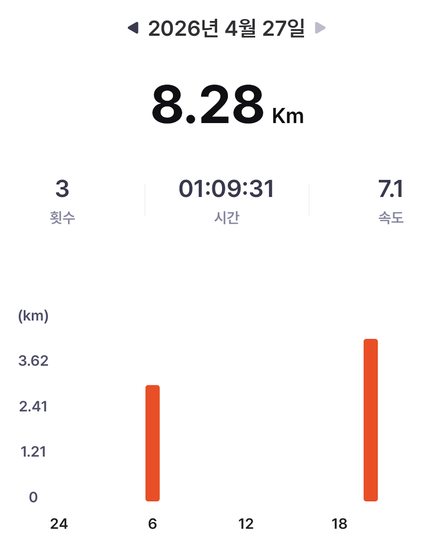 [M2E] 2026.04.27월 - 8.28km 오늘의 운동 완료 (목표 4km)