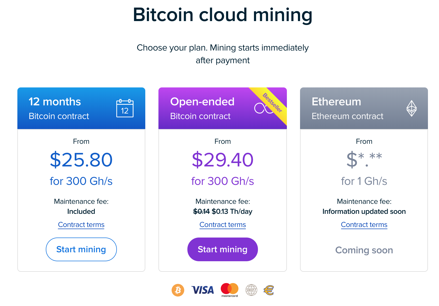Payment methods: BTC, Visa/Mastercard, Sepa Wire Transfer or Swift Wire transfer.