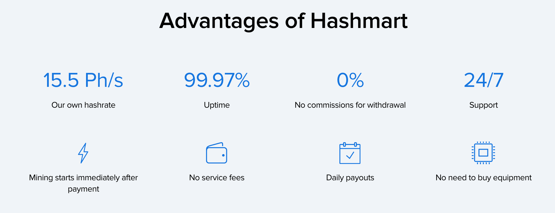 Having 15.5 Ph/s of entire mining power, more than 1,000 enthusiastic excavators, 99.97% uptime and all day, every day customer help on record that its dispatch two years prior, Hashmart gives severa different advantages that are structured exclusively to advantage you. Going from no administration charges, no withdrawal costs and impediments, right to every day payouts and a constant demo account, Hashmart has got you secured.