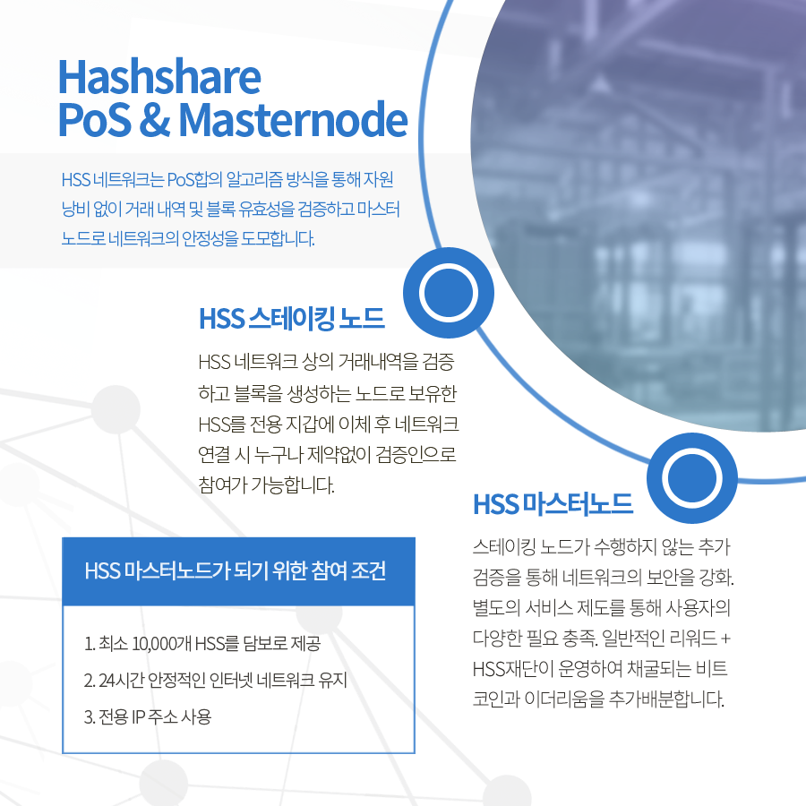 해시쉐어 마스터노드는 스테이킹 노드가 수행하지 않는 추가 검증을 통해 네트워크의 보안을 강화하고 별도의 서비스 제공을 통해 사용자들의 다양한 필요를 충족시킨다고 합니다. 해시쉐어 마스터노드에겐 네트워크 참여에 대한 리워드가 프로토콜에 따라 배분될 뿐 아니라, 해시쉐어 재단에서 운영하는 플랫폼 사용자들에겐 재단에서 직접 운영하여 채굴되는 비트코인과 이더리움을 추가로 배분받을 수 있다고 합니다.