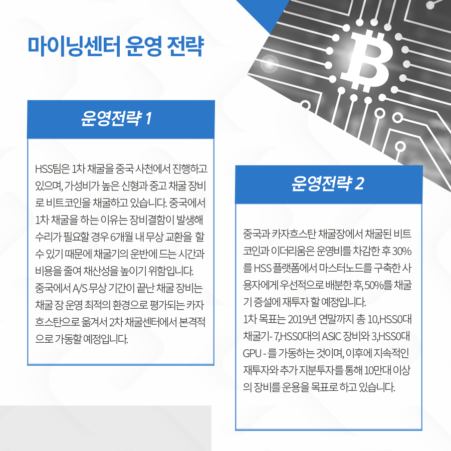 중국 및 카자흐스탄 채굴장에서 채굴되는 비트코인과 이더리움은 운영비를 차감한 후 30 % 를 HSS 플랫폼에서 마스터노드를 구축한 사용자에게 우선적으로 배분한 후, 50 % 채굴기 증설에 재투자할 예정이라고 합니다.