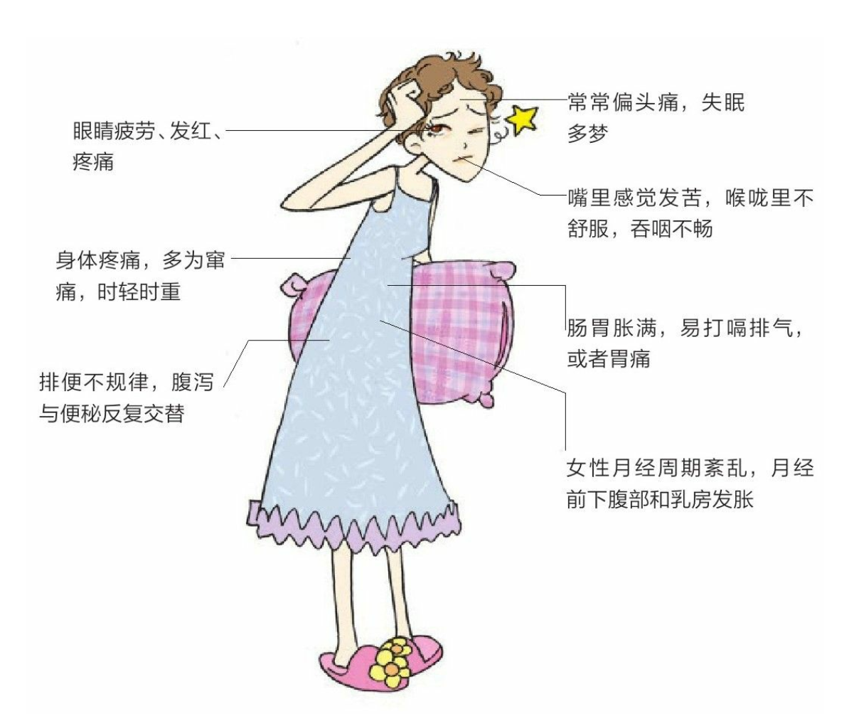 胃肠胀气、偏头痛、积食、经前期综合征、月经延迟、乳腺增生、慢性胃炎、胃溃疡等。