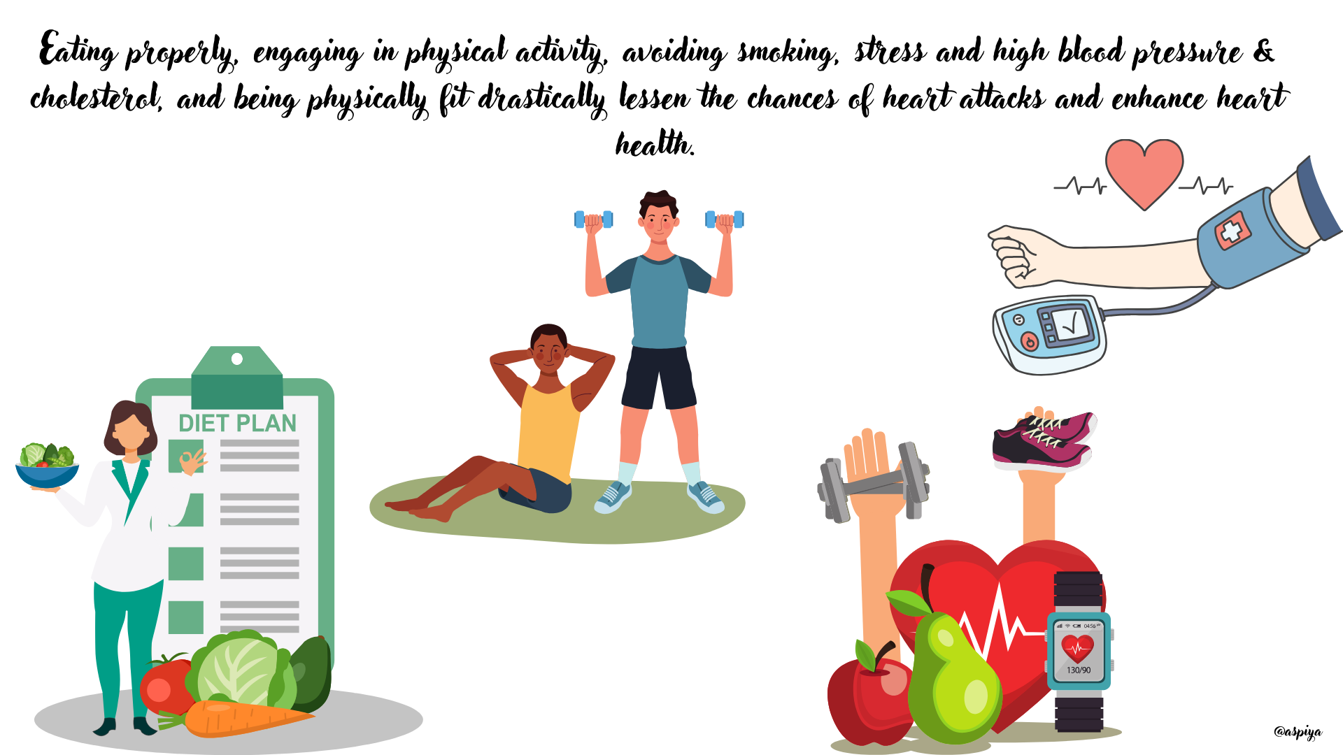 🔹Regular Exercise: Take moderate exercise for at least 30 minutes per day. Quit Smoking: Do not smoke anything because it might lower your chances of a heart attack.