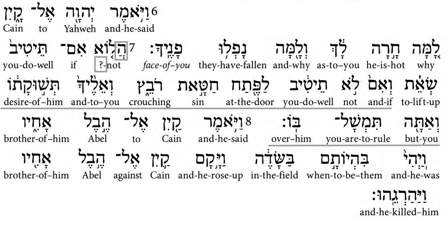 The only thing I am pointing out here is the use of hey marking the beginning of a question. It usually means "the" or signifies "in the direction of" something. I also did underline the father's warning to Cain.