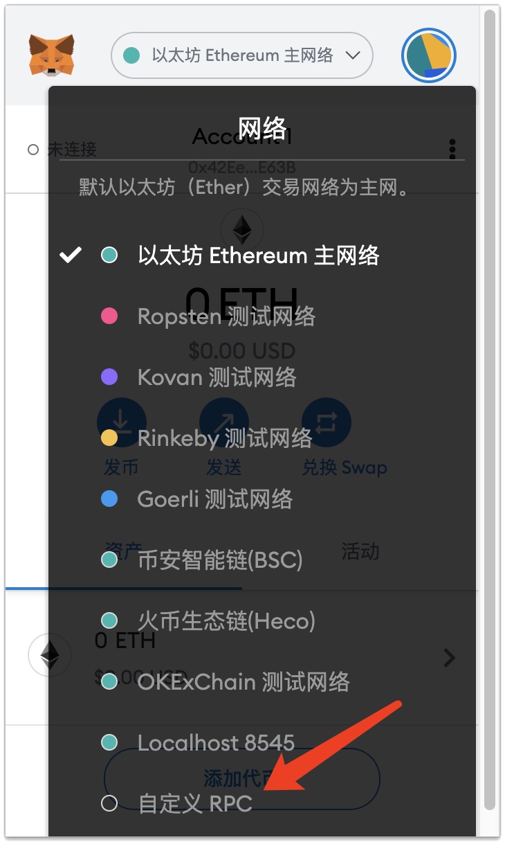 点击钱包右上角的“以太坊网络”,拉到最后,点击“自定义RPC”,就能自己添加币安和火币的网络了。