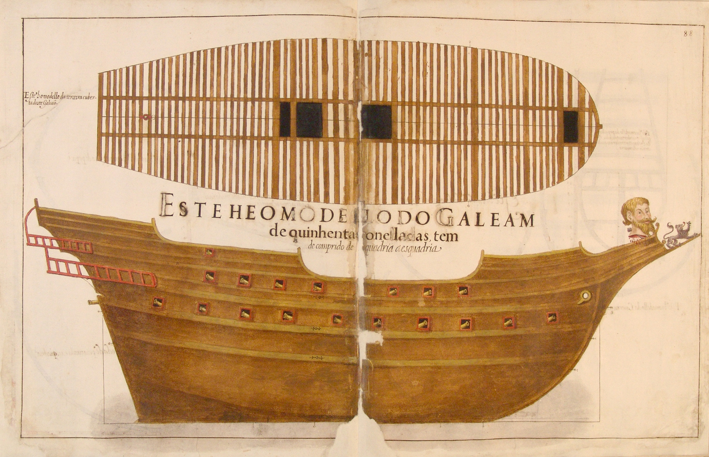 ( Image: A techincal drawing of a late 16th century and early 17th century 500 tonne Portuguese galleon. Featured in the Portuguese ship-building treatise Livro de Traças de Carpintaria, or "Book of Draughts of Shipwrightry", compiled by the shipyard official Manuel Fernandes. 500 tonnes indicates the tonnage (cargo capacity) of the ship below the main deck, as per Portuguese regulations in the 16th and 17th century. )