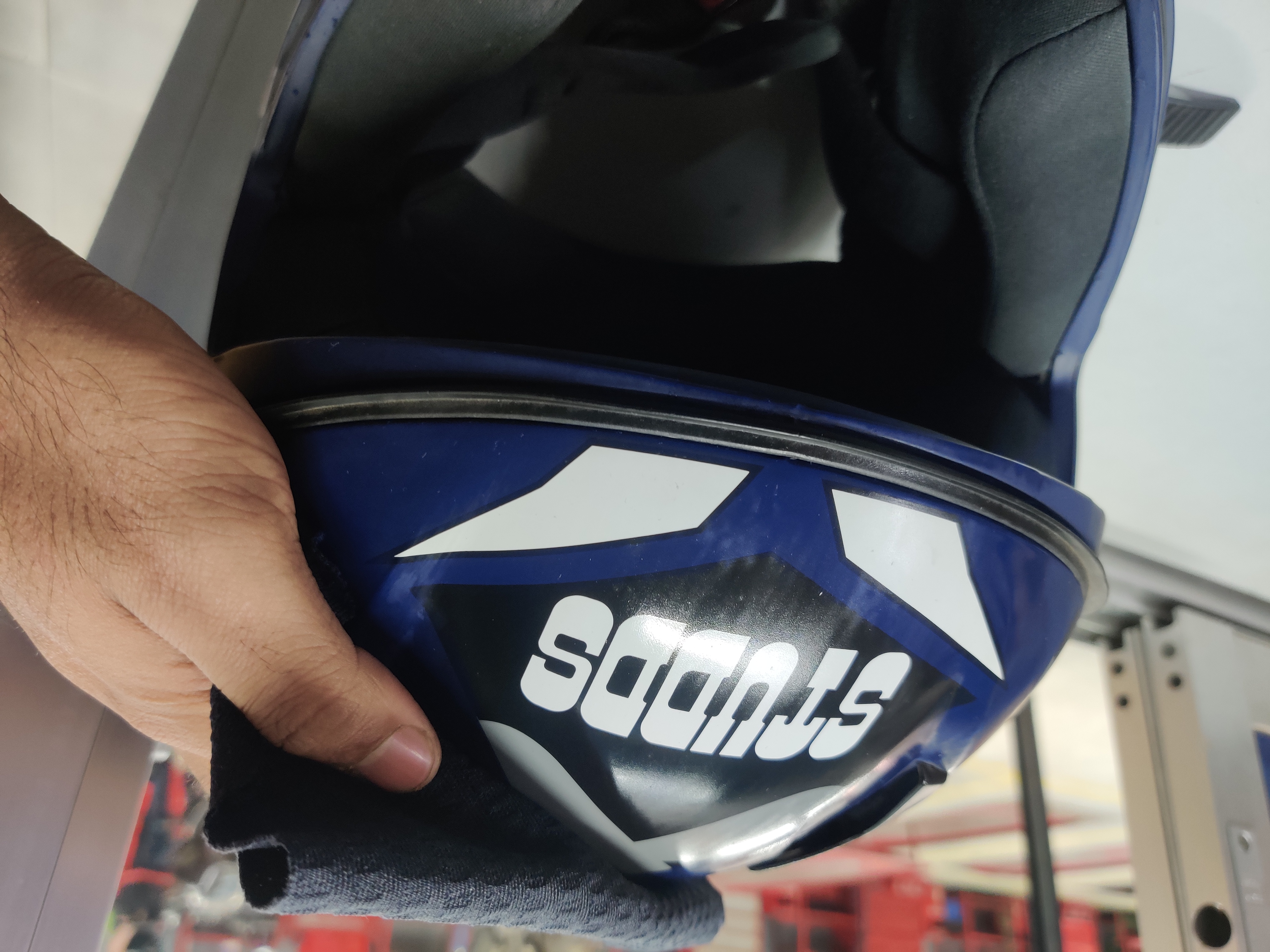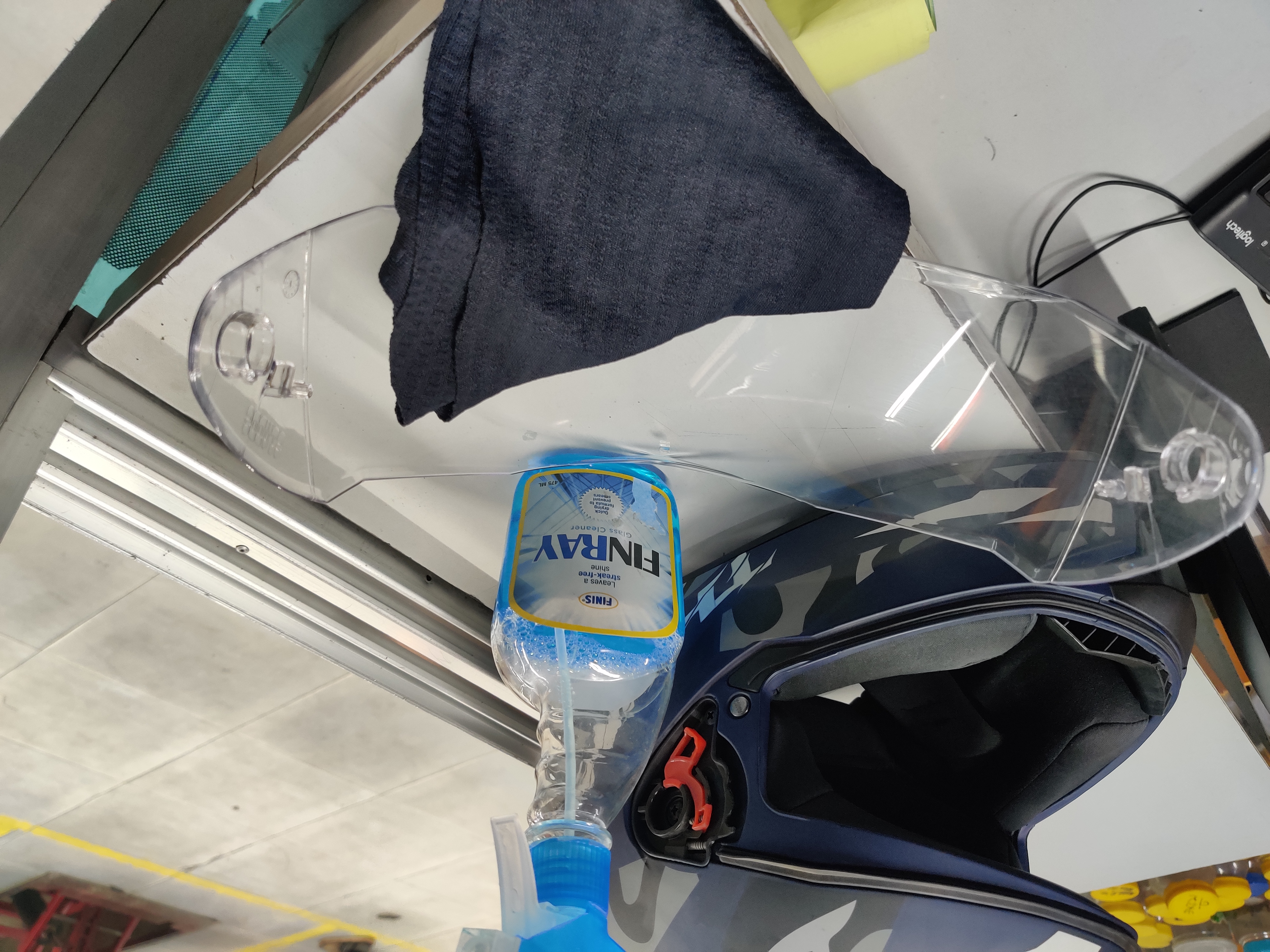 ভাইজর খুলার পর প্রথমেই বাতাস মারতে নিয়ে গেলাম টেকনিশিয়ান দের বে এর কাছে। প্রথমেই উচ্চচাপে বাতাস মেরে আলগা যে ধুলা গুলো আছে সেগুলো পরিষ্কার করে নিলাম। এরপর প্যাডিং এর ভিতরে বাতাস মেরে ভিতরের ধুলা গুলো ও পরিষ্কার করে নিলাম। এবার ভাইজর এর কোণা গুলো ভালো ভাবে বাতাস মেরে পরিষ্কার করে নিলাম। বেশ এবার গ্লাস ক্লিনার দিয়ে মুছে নেওয়ার পালা। তাই করলাম। প্রথমেই ভাইজর ক্লিন করলাম খুব ভালো ভাবে। একটু পাতলা কাপড় নিয়েছিলাম। সেটাতে গ্লাস ক্লিনার ছিটিয়ে খুব ভালো করে ভাইজর পরিষ্কার করে নিলাম। ভালোই ক্লিন হয়েছে দেখলাম। এবার ভাইজর একটা ভালো যায়গায় রেখে হেলমেট এ হাত দিলাম। আবার গ্লাস ক্লিনার নিয়ে হেলমেট পরিষ্কার করা শুরু করলাম। একবার মুছতেই দেখি কি সুন্দর চক চক করছিলো আমার সখের হেলমেটটা। দেখতেও বেশ দারুন লাগছিলো। যেটা আপনারা ছবি দেখেই বুঝতে পেরেছেন আশা করি। আসলে নিজের সখের জিনিশ গুলো হাতে ধরে পরিষ্কার করতে ভালোই লাগে। আমি হয়তো অতটা ভালো পরিষ্কার করতে পারিনি। তবে আমার সেরা টা দিয়ে পরিষ্কার করেছি।