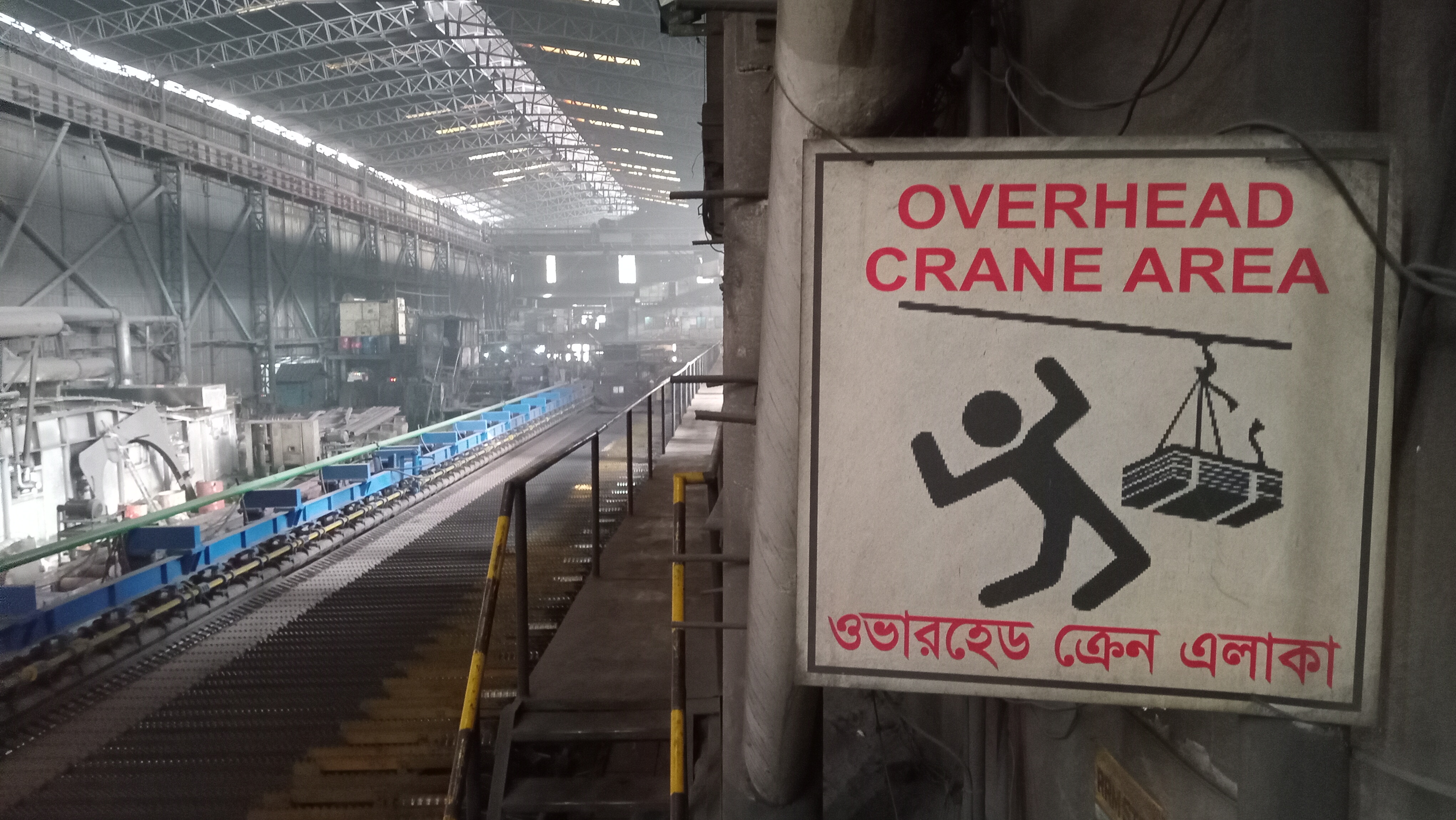 The rolling mill is closed today because there are some mechanical problems in the mill. This is machinery, so sometimes problems arise. Not only that, but a few sections have to be changed in a day. Although you may not understand. The section is that the rod has different sizes, so to make the size, there is some mechanical work, otherwise it cannot be changed. This picture gives some very important instructions; there is a machine moving above this area, and there is a path to move down. The reason for putting this picture here is that you will be moving through here. Then you will move around, looking around and upwards. So, this picture is given here to maintain caution.