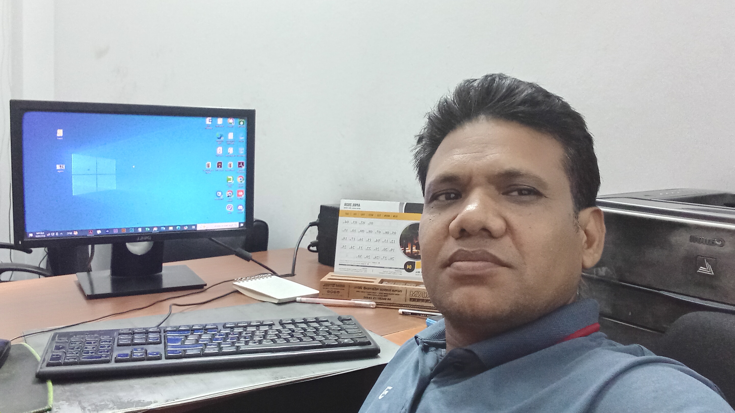 This is my living room where I sit and do my office work every day. I post a lot of pictures, and I took a picture of my workplace and posted it. Today I am in a good mood, so the mood is good. Today, there is less work pressure in the office, so I took a picture on my mobile in a relaxed mood. The room I work in has an air conditioner, a computer, a landline phone, a printer, and a few chairs besides me. To my right is a cabinet containing important factory supplies.