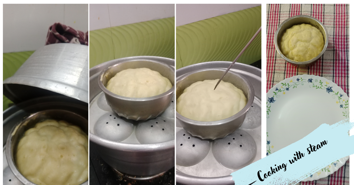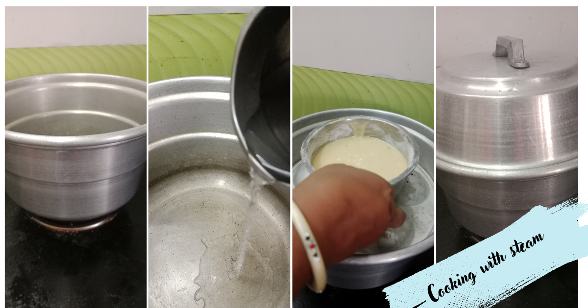 Now, take the bowl filled with the batter, place it inside the vessel, and cover it to steam. Then, steam it for approximately 25 minutes.