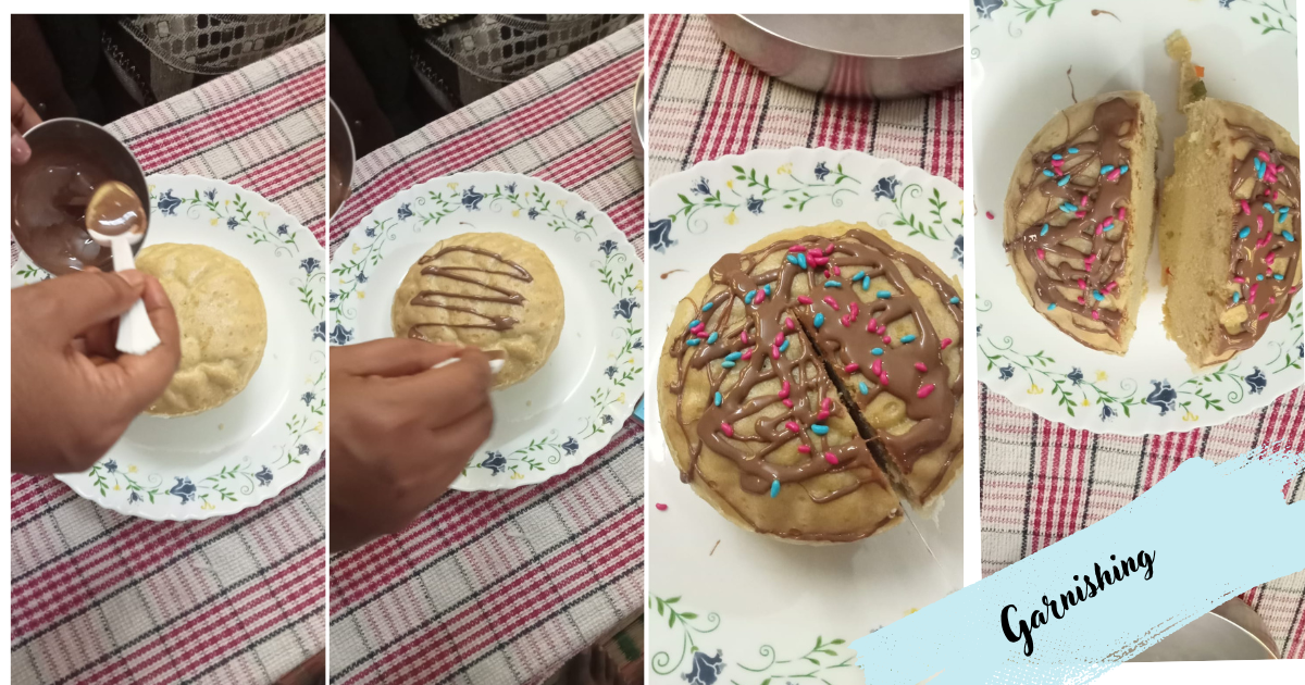 Once the cake is fully boiled—it should be soft to the touch—transfer it onto a plate. Pour melted chocolate over it, then add candies or your desired garnishes to give it a beautiful finish.