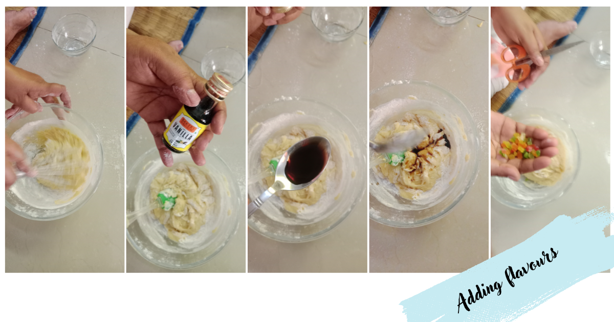 Add a spoonful of vanilla essence; then, add the required amount of tutti-frutti or raisins, and mix the batter thoroughly until it resembles idli batter.