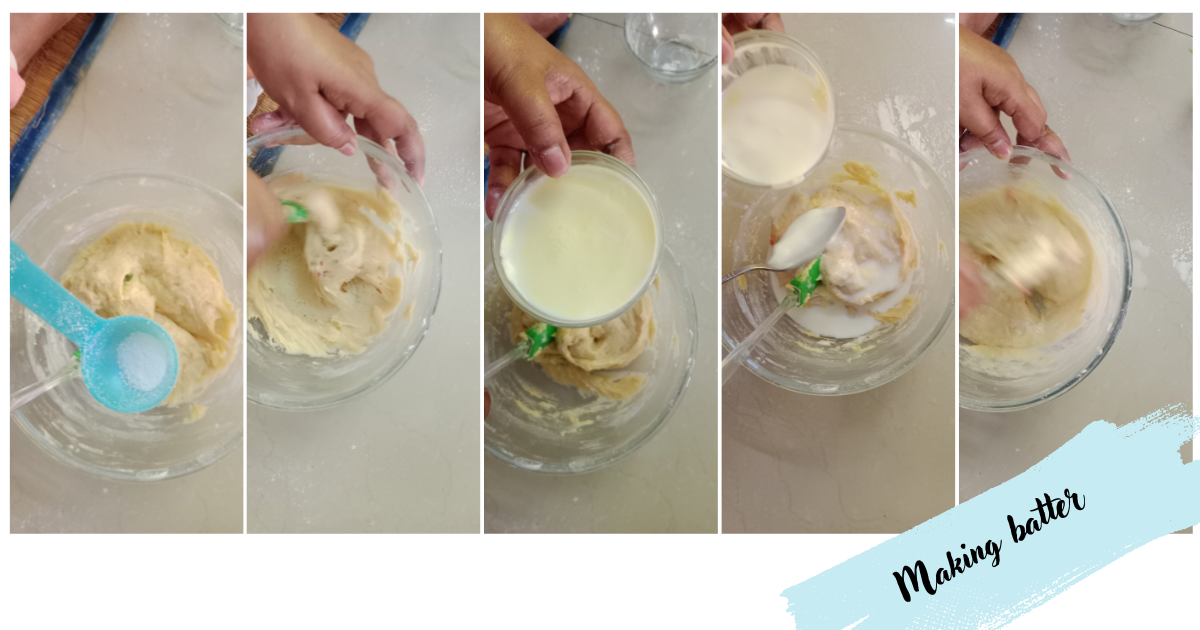 Now, add one cup of milk and mix thoroughly until the batter becomes quite soft and loose. Let the batter prepared in this manner rest for a short while—specifically, for about ten minutes.