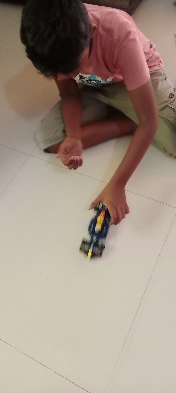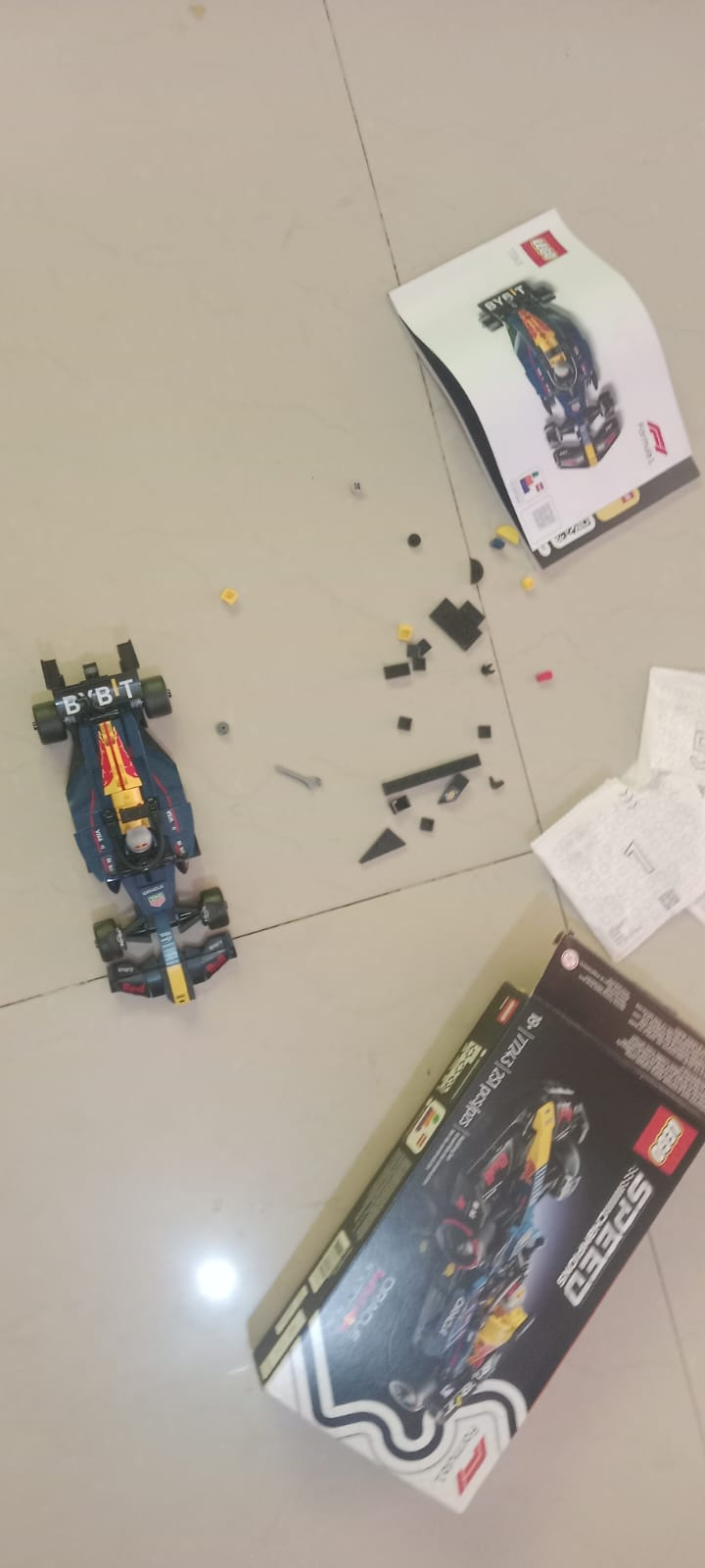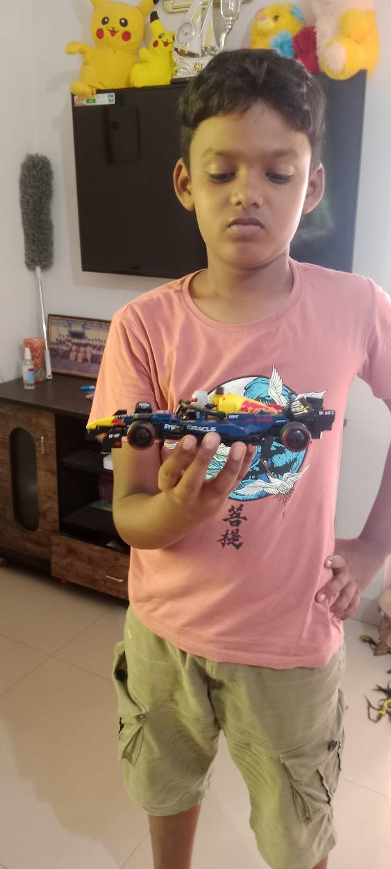After working diligently for about an hour to assemble it correctly, he had created a truly magnificent model. I was absolutely amazed to see it. While he was assembling it, he became quite tense whenever he encountered a few errors; however, I refrained from helping him, as I wanted him to figure out and resolve the issues on his own. Eventually, by repeatedly consulting the manual and fitting the right parts into the right places, he successfully completed the F1 car. Once it was ready, he drove it around and played with it, which brought me great joy.