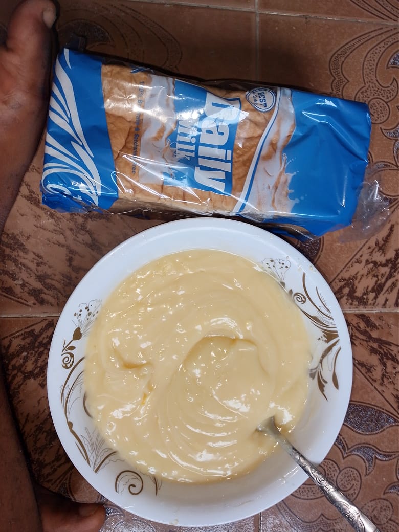 When I got back to the house, I took my bath and then I went to the shop to get what I needed for breakfast. I had soup at home but I wanted to prepare something else so I could eat, something lite for that. I bought bread and pap and I came back to the house and made the pap then ate it for my breakfast.