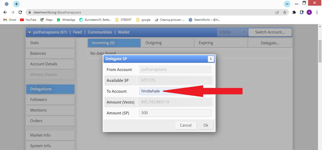 - Here you will get the option of delegation on the left side. Then you have to go to the option named delegate and write the manual number of your steem. You can write here as much steem as you want to delegate. As I want to delegate 500 to @Hindwahle, I have written 500 Steem (To account) similarly you can delegate Steem by entering your Steem value.