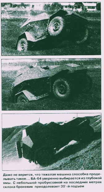 他们很快就制造了一辆新车。 10月13日,他们制作了第一个计划和图纸,1942年1月9日,该车首次驶出(但没有炮塔),2月17日,他们向人民委员马雷舍夫展示了成品车,3月14 日,它以 BA-64 的名称被军队接纳,并开始制造其中的许多产品。 3月3日,BA-64和T-70被展示给斯大林。这辆装甲车的驾驶者是 V.A.格拉乔夫组装了第一个样品。斯大林生病了,在克里姆林宫大楼里观看。格拉乔夫决定开个玩笑,把车开上冰冷的台阶,来到斯大林站着的门口,然后掉头下楼,表明这辆车可以在任何地形上行驶。