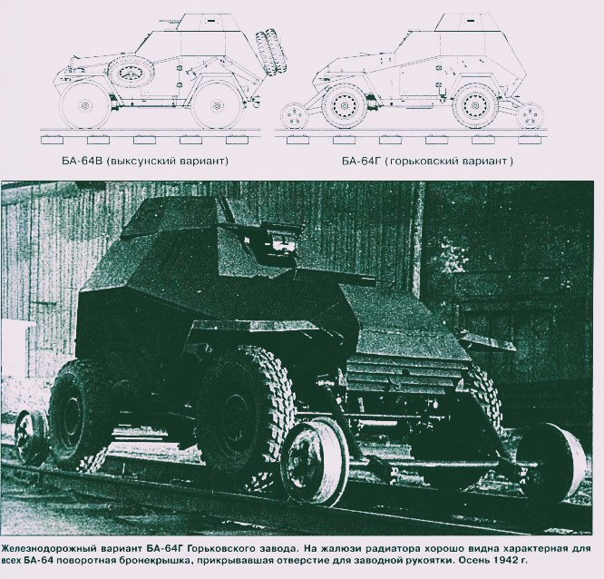 与《Vyksa》同时,高尔基也制作了自己的版本。这个解决方案很不寻常,但却是通用的。根据计划,该车已经配备了宽轮,通过普通轮(也提供牵引力)保持在铁轨上,但前后安装了由弹簧升起的铁轨。载着汽车的手推车。他们还把变速箱做成了倒档,这样就不会有坏掉的问题,车子可以以同样的速度来回行驶。他们称之为 BA-64G。 11 月 8 日,第一节车厢被放置在铁轨上,但车厢本身已经弯曲。我们还注意到经常出轨。通过强化发动机进行了改进。 1月12日,车辆再次被检查。车没有弯曲,但车又滑出了轨道,而且发动机正在升温。高尔基工人们想做出第三种选择,但没有。他们没有制造 BA-64G,但近 30 年后,这些经验在 BTR-40 的铁路改装中派上了用场。