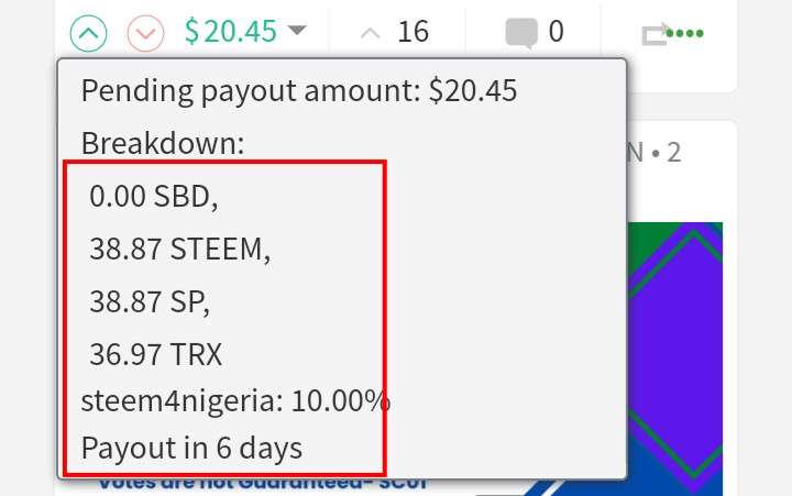 The debt ratio is now at 10.96% which implies that the printing rate of SBD would be 0% and it's evident from the tool above. As such, the authors' 50%/50% reward settings now would be received in STEEM and SP and you can see that on one my articles pending payout below.