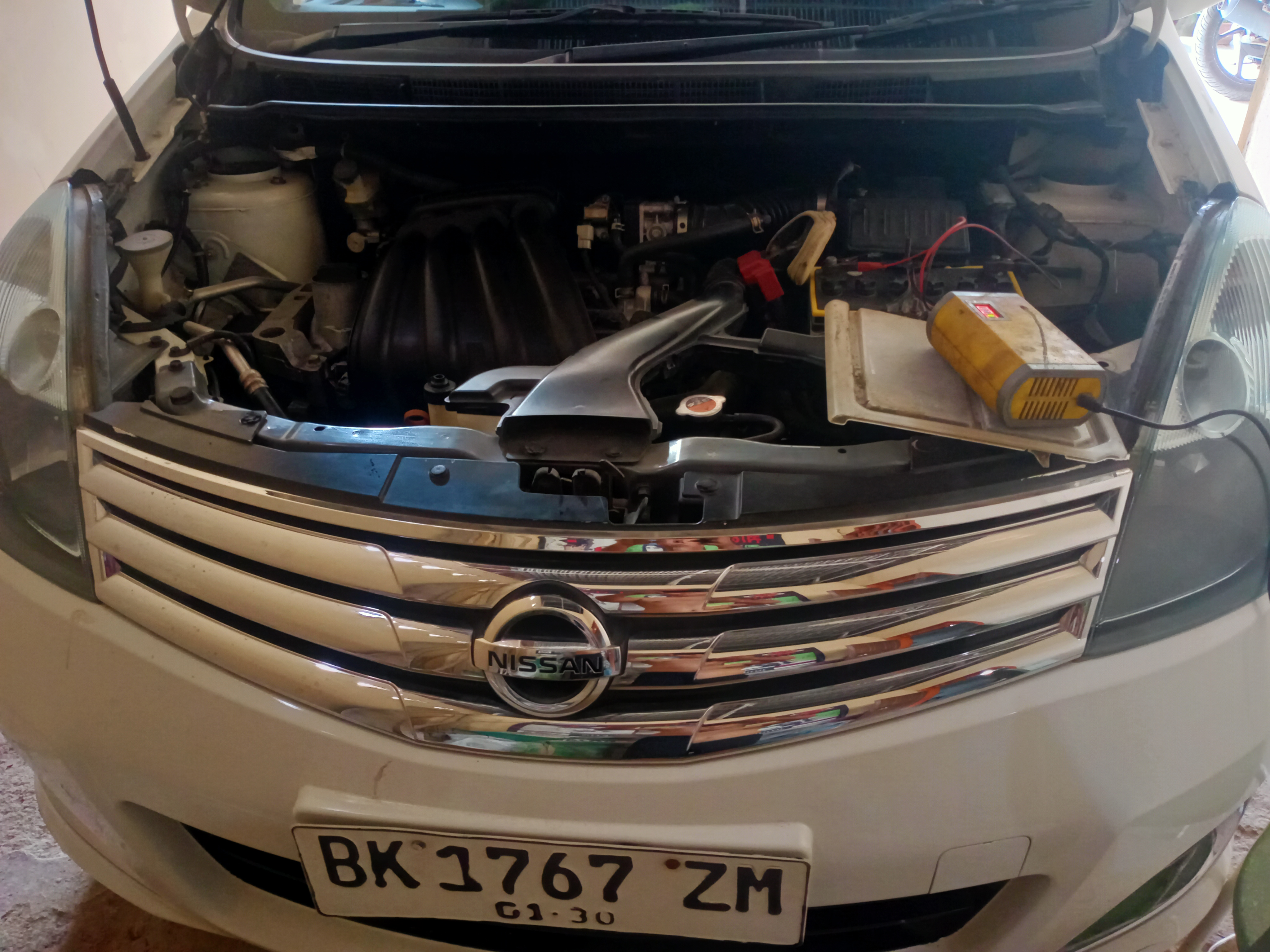 Aku singgah di bengkel milik adikku di Keudee Matangkuli untuk meminjam charger aki mobil dan kemudian aku segera kembali ke rumah untuk mengecas aki mobil kami.