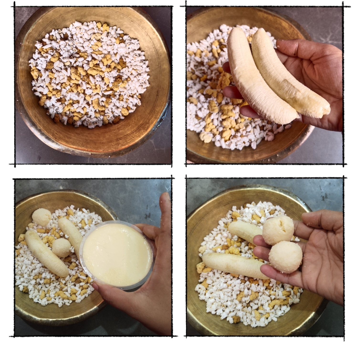 এরপর দুটো কলা নিয়ে নেব। সেগুলোর খোসা ছাড়িয়ে খই এর মধ্যে দিয়ে দেব।