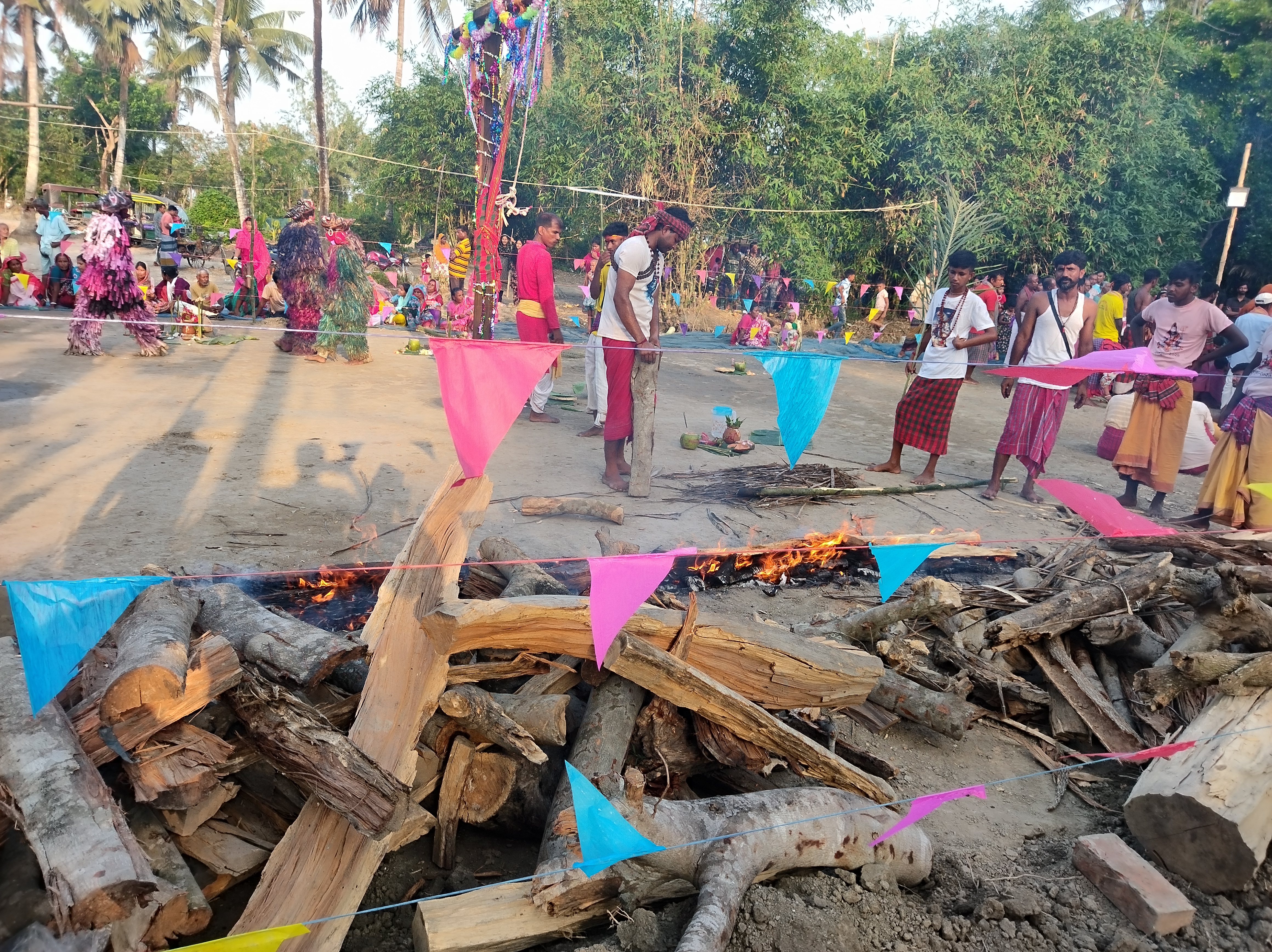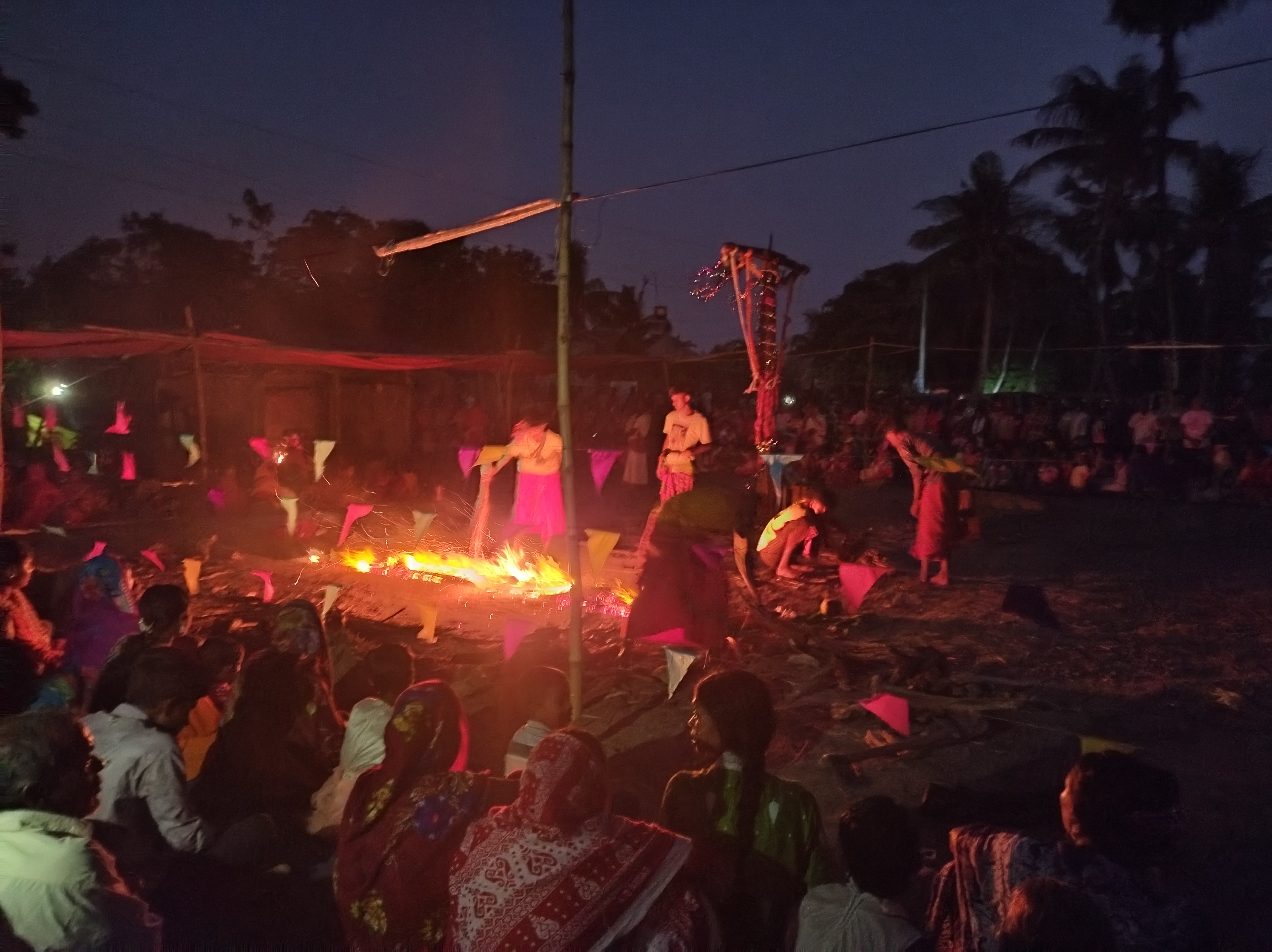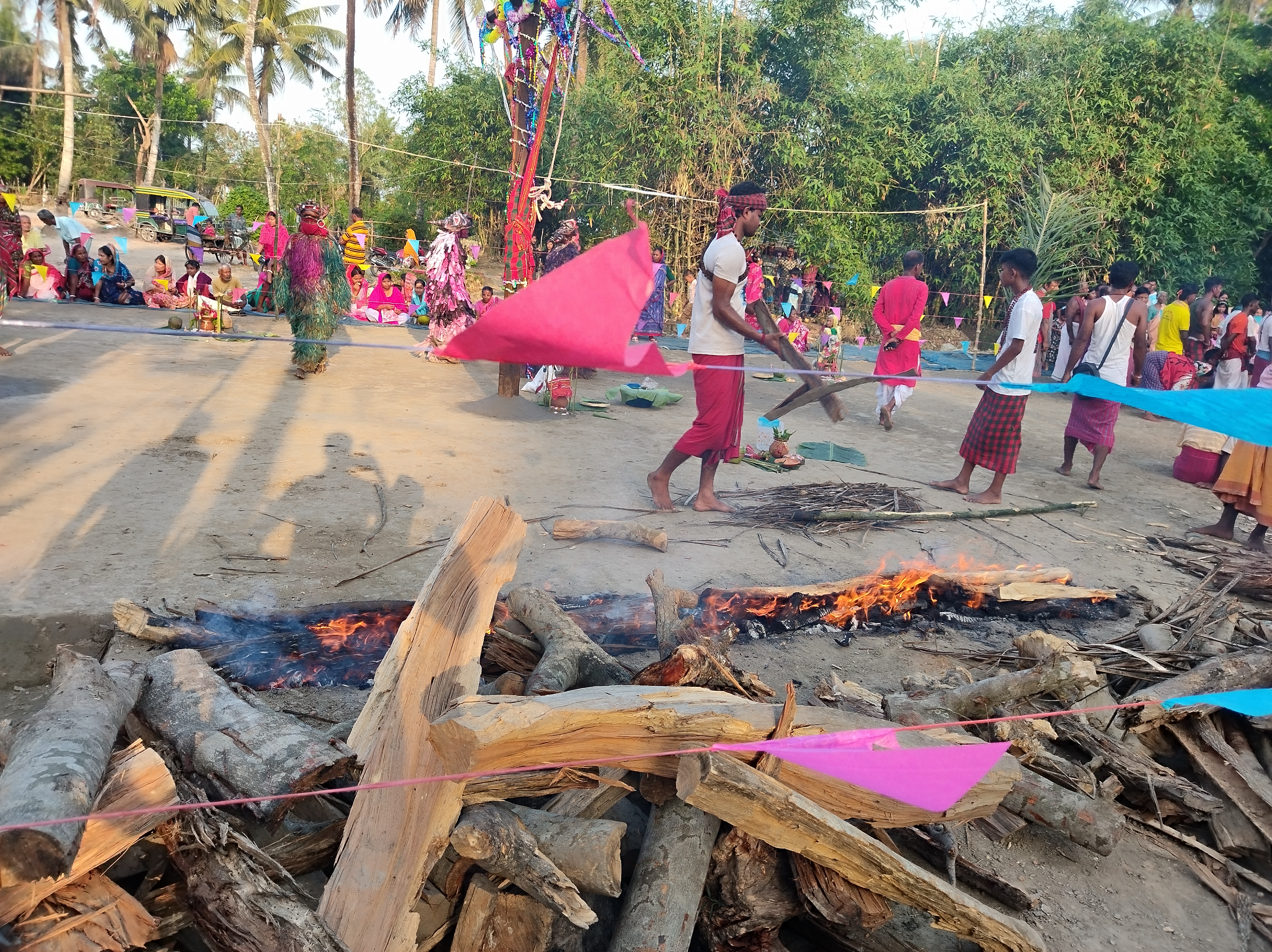 দুপুরের পরপরই পূজার কার্যক্রম শুরু হয়ে গিয়েছিলো। অগ্নি সন্ন্যাসীতে আগুনের উপর দিয়ে হেঁটে যেতে হয়। তাই আগে থেকে আগুন প্রস্তুত করে রাখতে হয়।