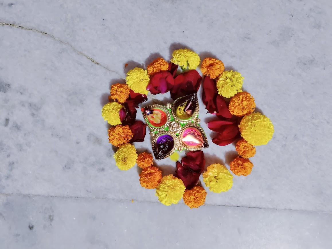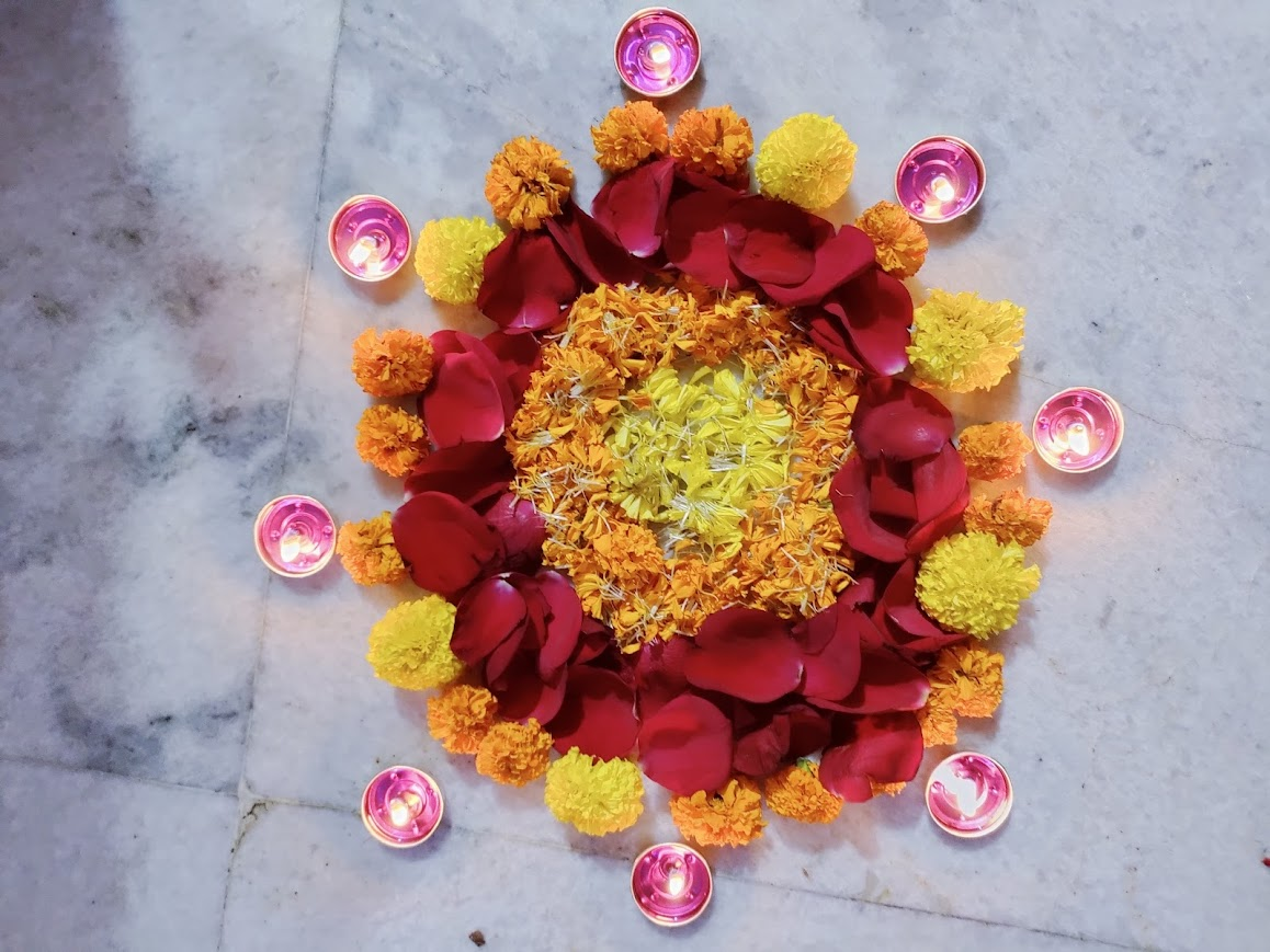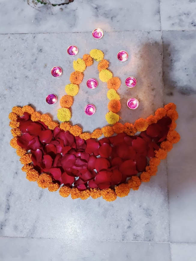 গাঁদা ফুল, রক্ত গোলাপের পাঁপড়ি আর নকশা-কাটা এলুমিনিয়ামের মোমের প্রদীপ নিয়ে করা আলোকসজ্জা ।