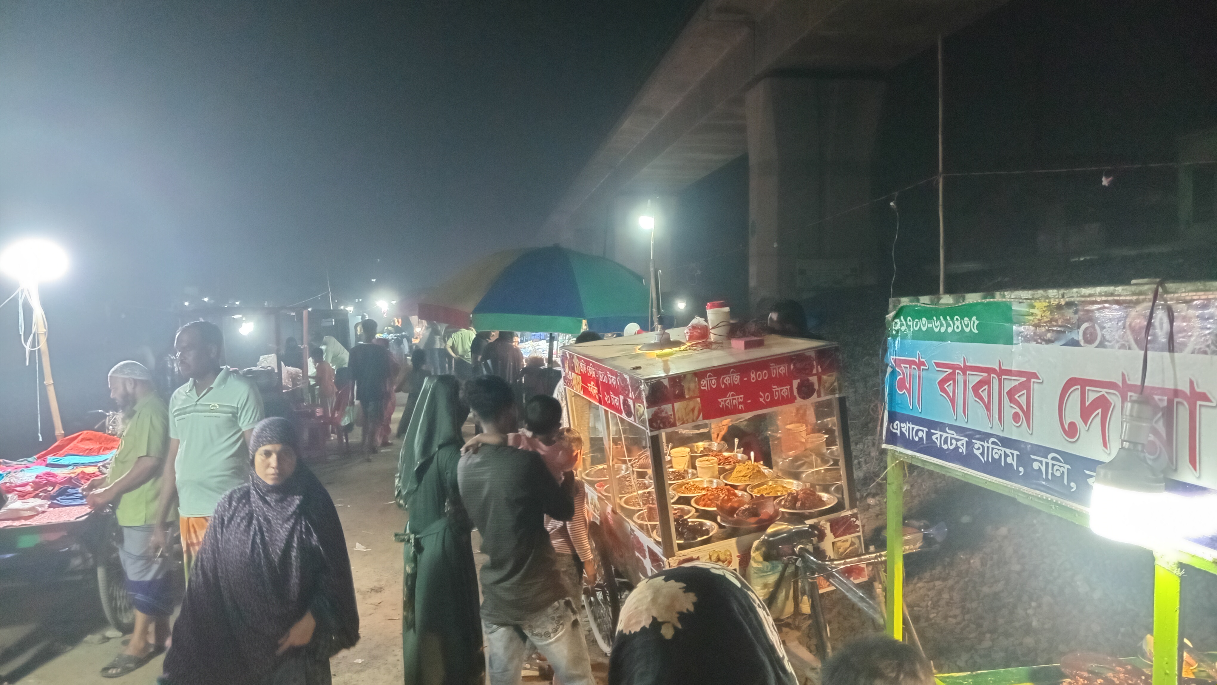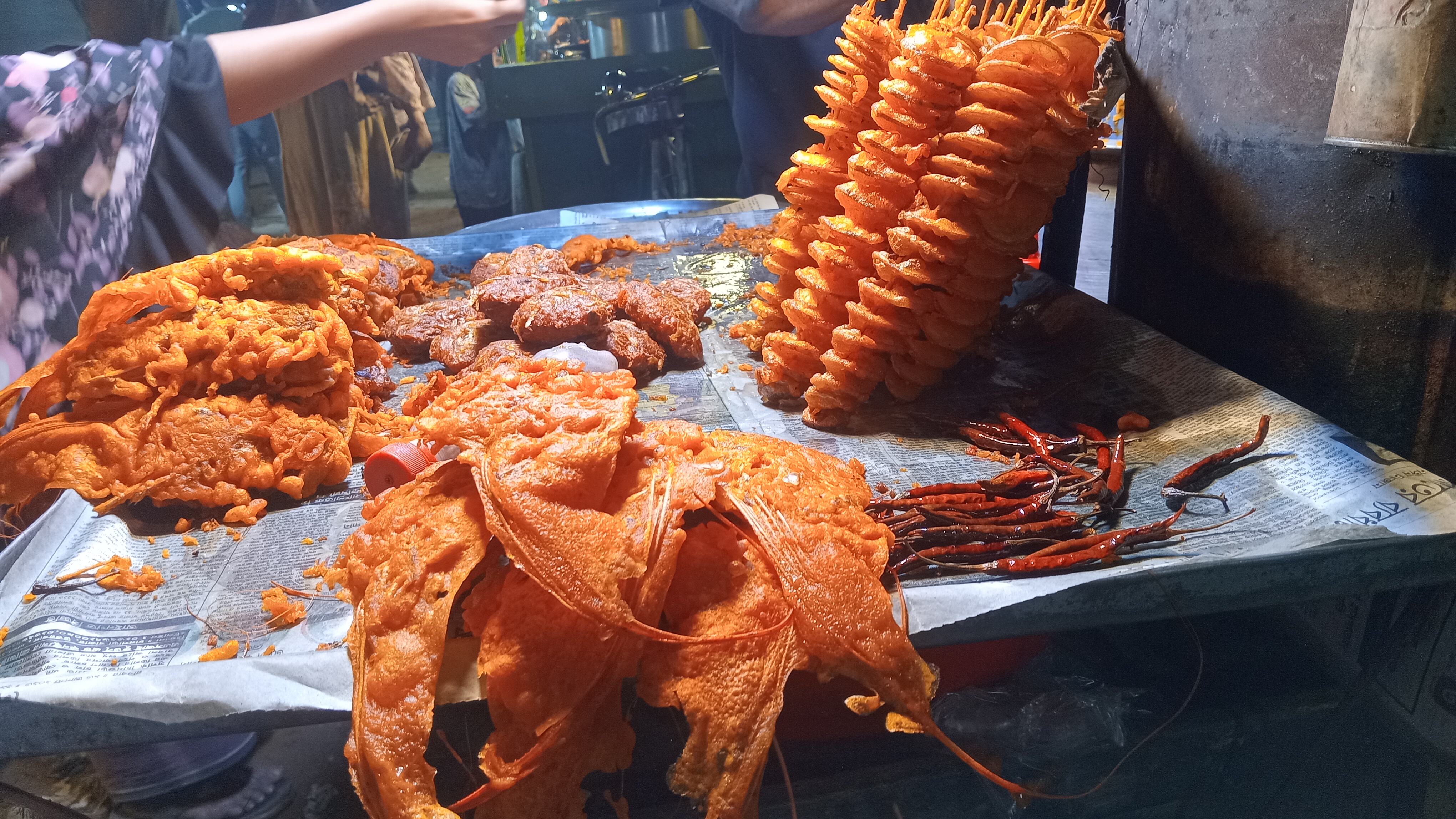 It's around 9:45 pm, and a fair is going on near the railway line. Since I'm outside, I'll take a look around and see if there's anything worth buying. So far, I've seen that the fair is going on and no shop has closed. The special attraction of the fair is the fried potato chips and fried shrimp heads. These are fried and arranged in such a way that customers are automatically attracted.