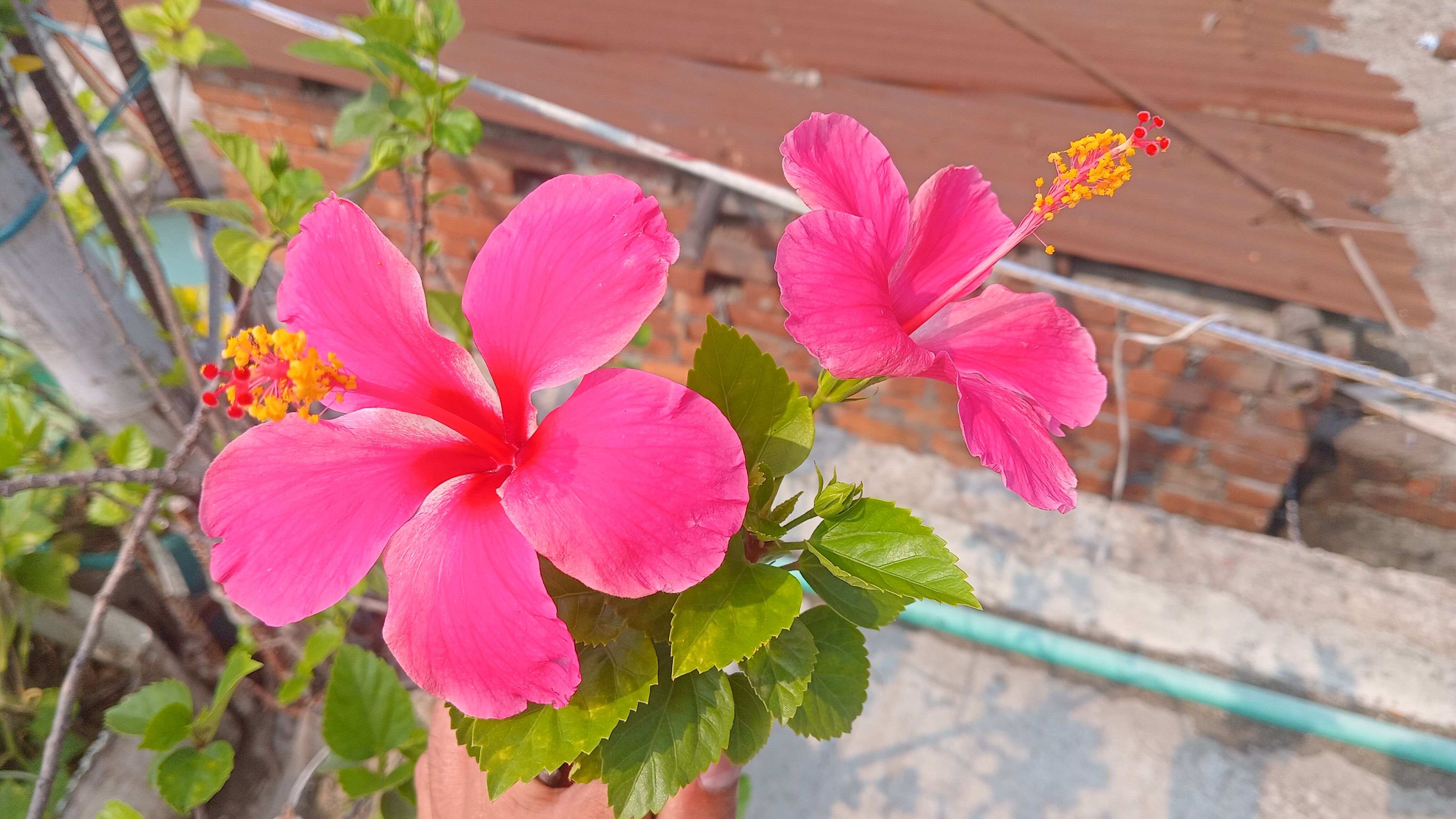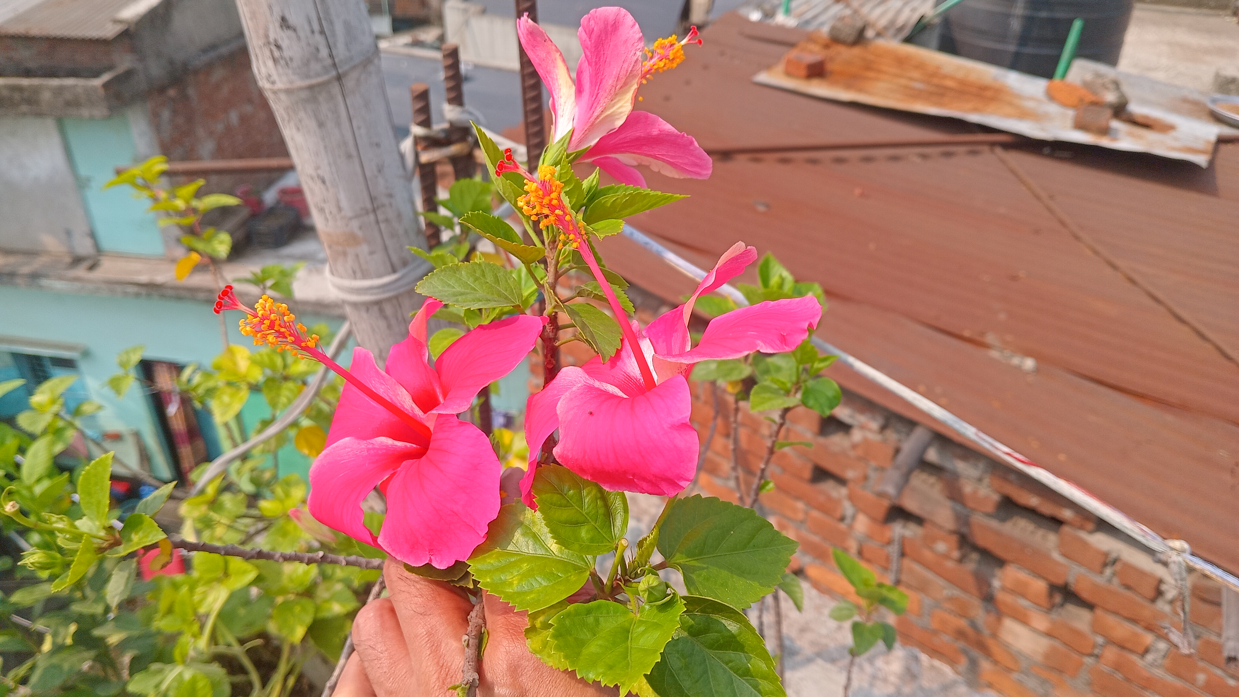 First of all, I would like to extend my floral greetings to you all from our rooftop garden. I came home this morning, freshened up, and went to the rooftop to dry my wet clothes in the sun. Today, three Chinese jasmine flowers have bloomed on a small tree. Seeing the flowers filled my heart. Apart from these Chinese jasmine flowers, other flowers have bloomed, with which we can offer puja this morning. If the flowers on the roof were not blooming, we would have to buy flowers and offer a puja. Because Thursday is a special day for the house, vegetarian food is cooked on this day. On this day, Lakshmi, the goddess of wealth of our Hindu community, is born, so we celebrate this day. Special rituals are performed for this purpose. Therefore, all kinds of flowers on the roof have been used. Today, so many beautiful flowers have bloomed on the roof, so I took a picture on my mobile after seeing the beauty of the flowers.