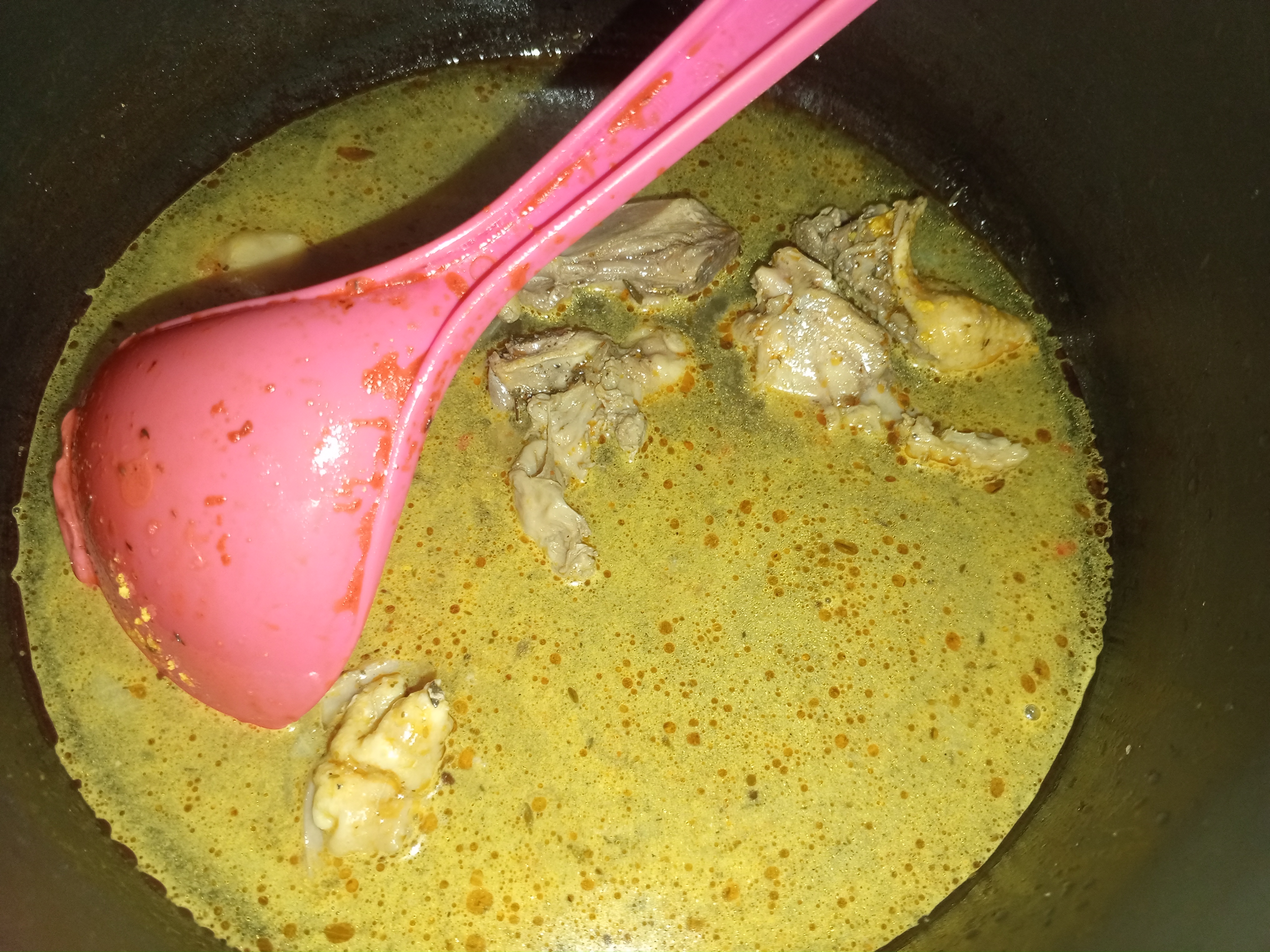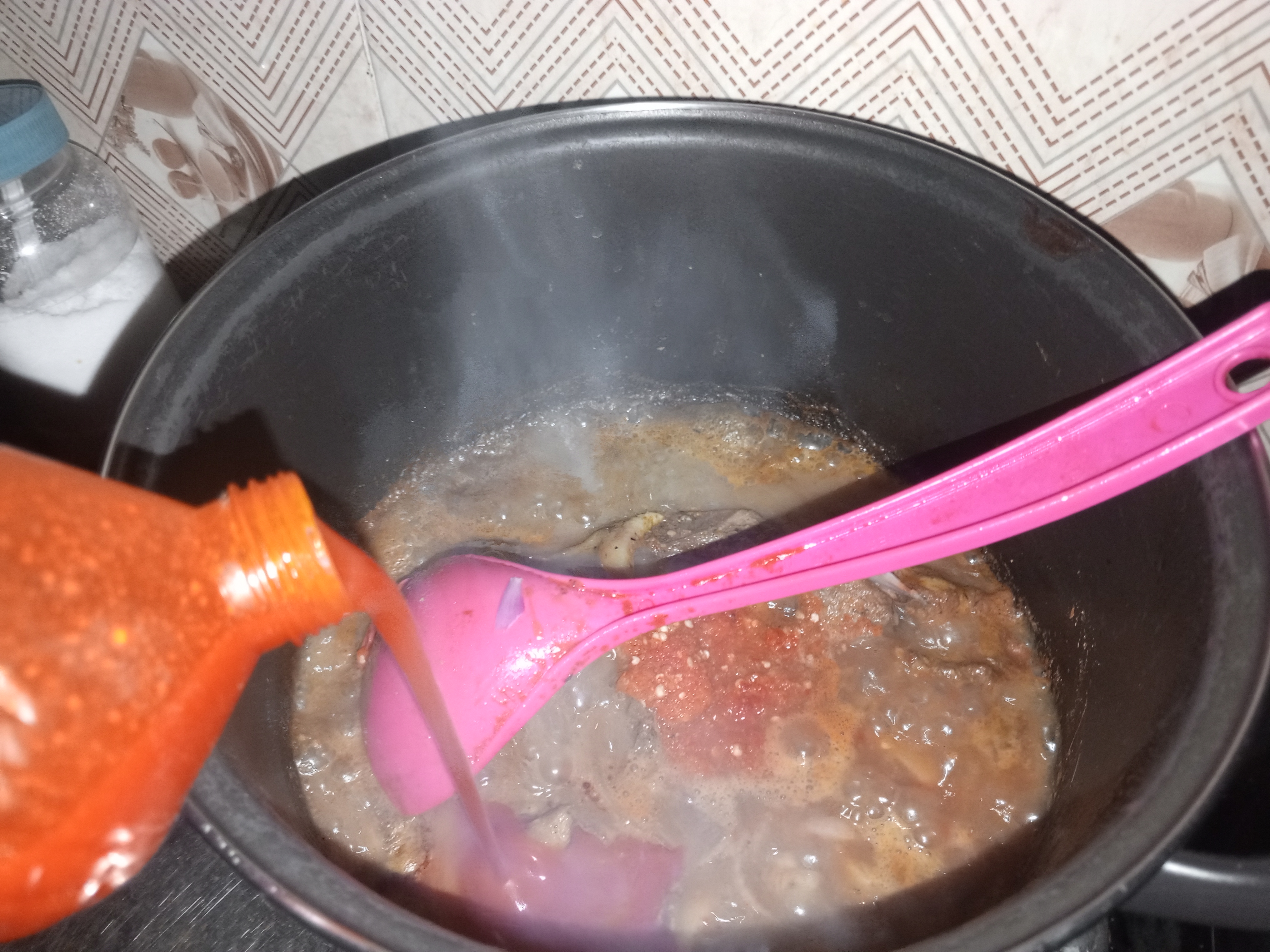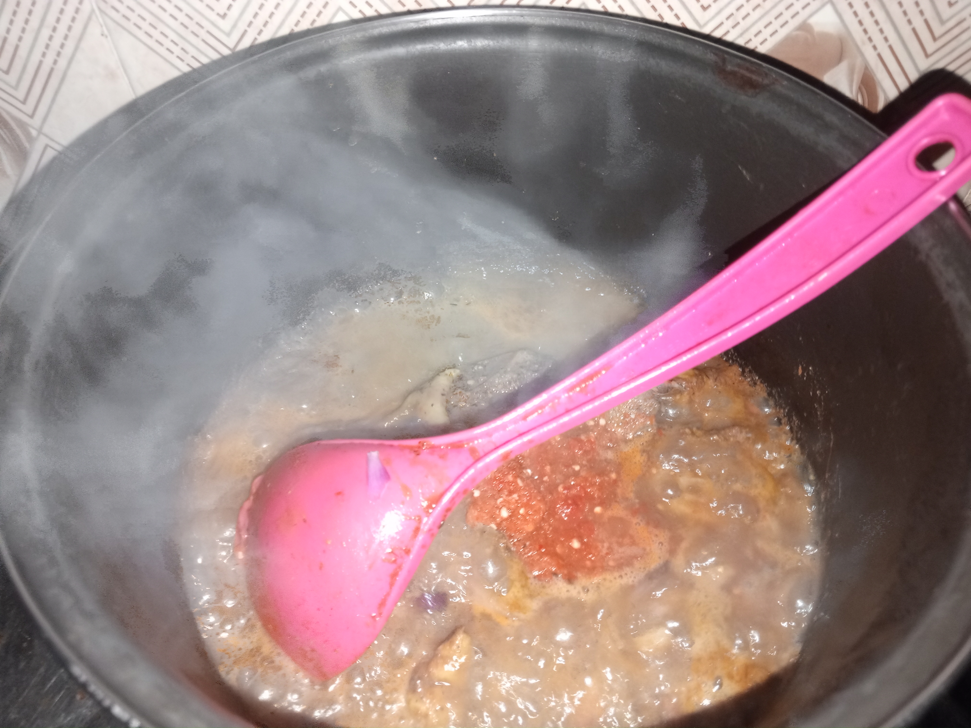 • Add washed blended pepper to the boiling stock and cover to steam properly with the meat.