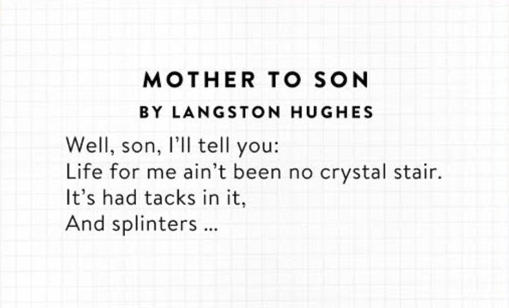 the poem "Mother to Son" by Langston Hughes. This poem is a powerful and moving piece of literature that explores themes of resilience, perseverance, and the enduring nature of hope.