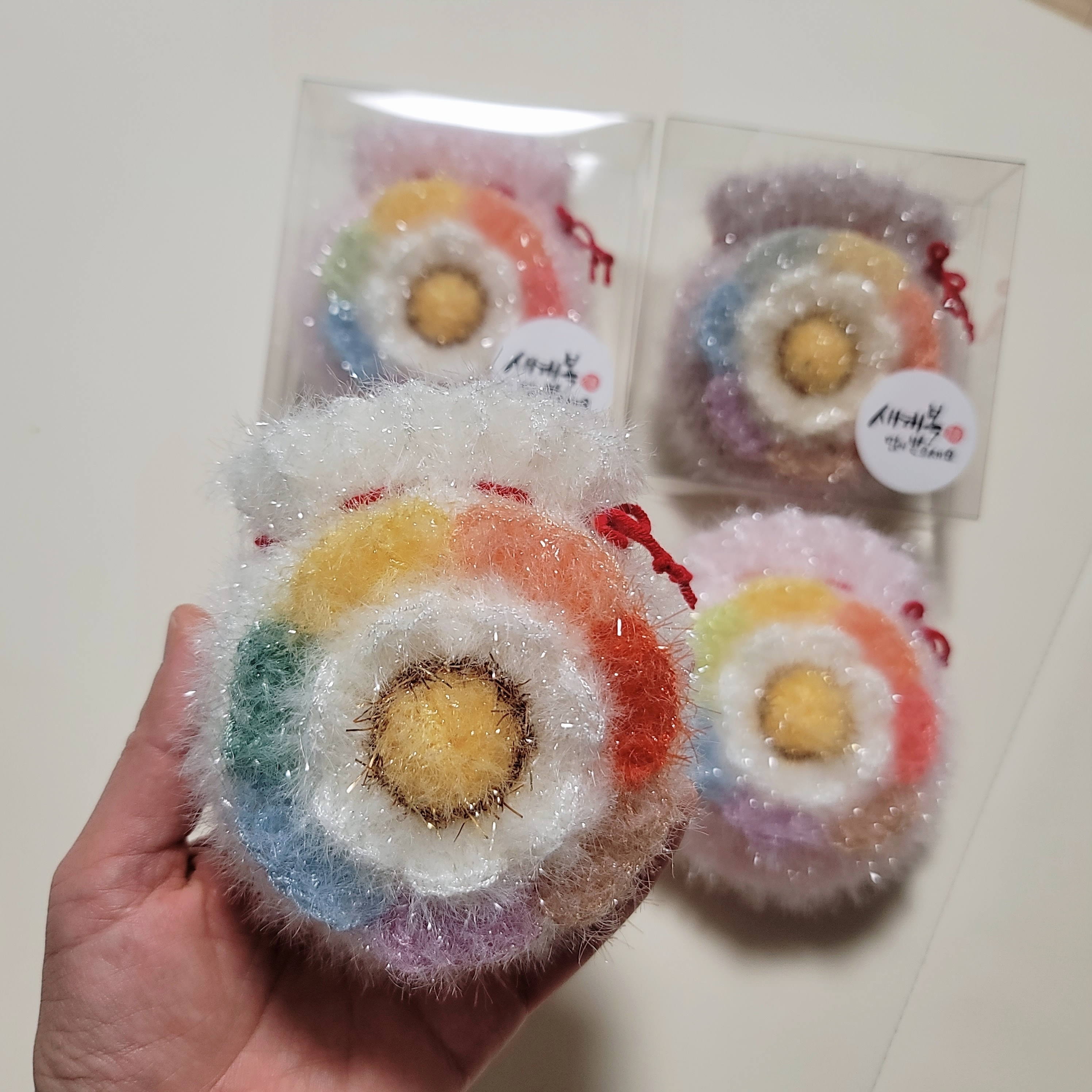설맞이 수세미leekowoon (69)in #hobby • 5 years ago (edited) 너무 이쁜 복주머니 수세미 뜰때도 색감이 넘 이뻐서 기분이 좋더라구요~~~ 요건 색동 복주머니~ 둘다 매력있지요? 요렇게 세뱃돈 담아서 조카들 세뱃돈 주려고 했는데 코로나때문에 얼굴도 볼수없게 되버렸네요ㅠ 얼른 코로나가 사라지는 날이 오길 기다립니다 #daily #kr