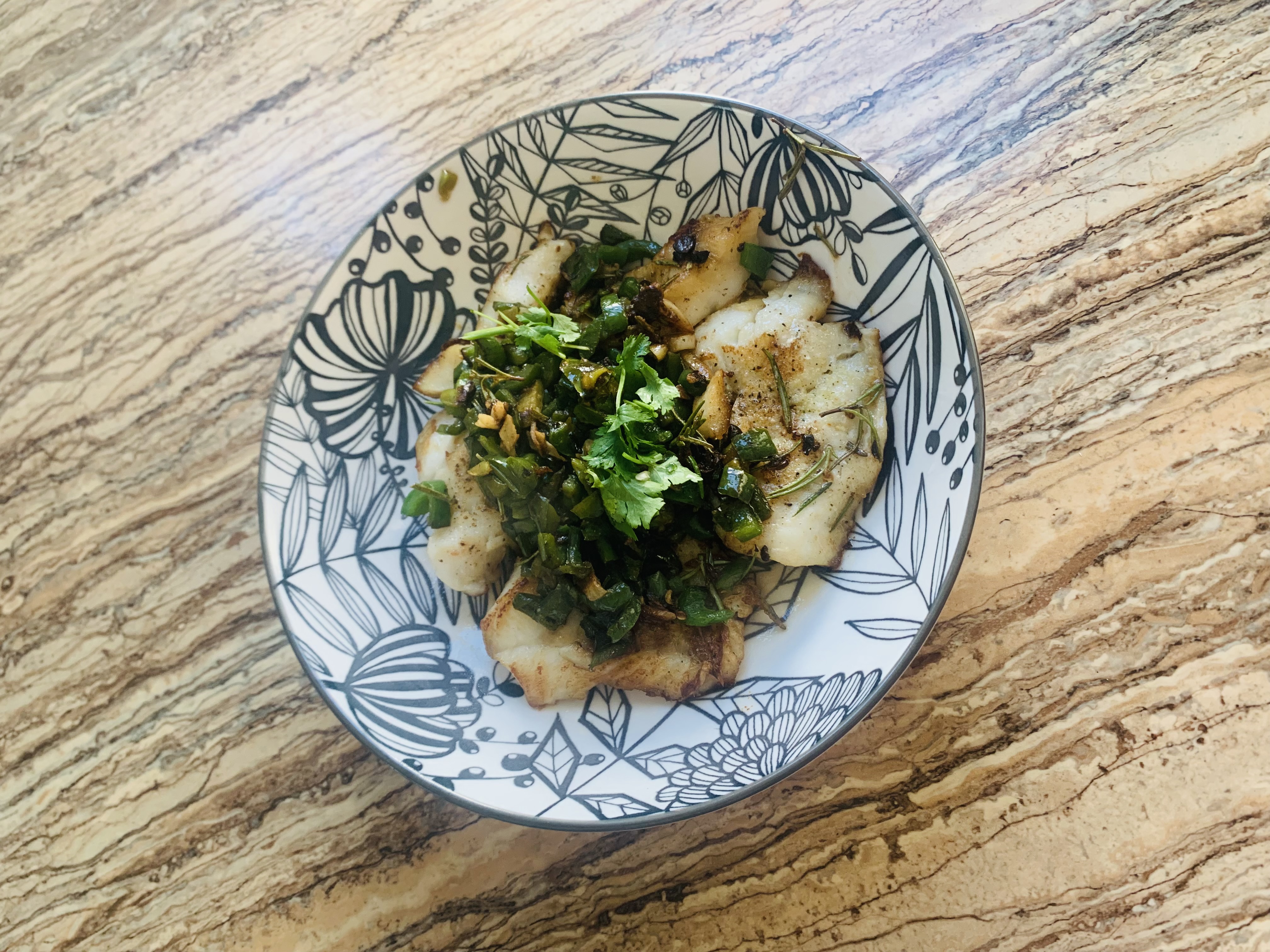 6,最后撒上香菜增香增色,一道鲜香四溢的煎岩鱼便完成了。