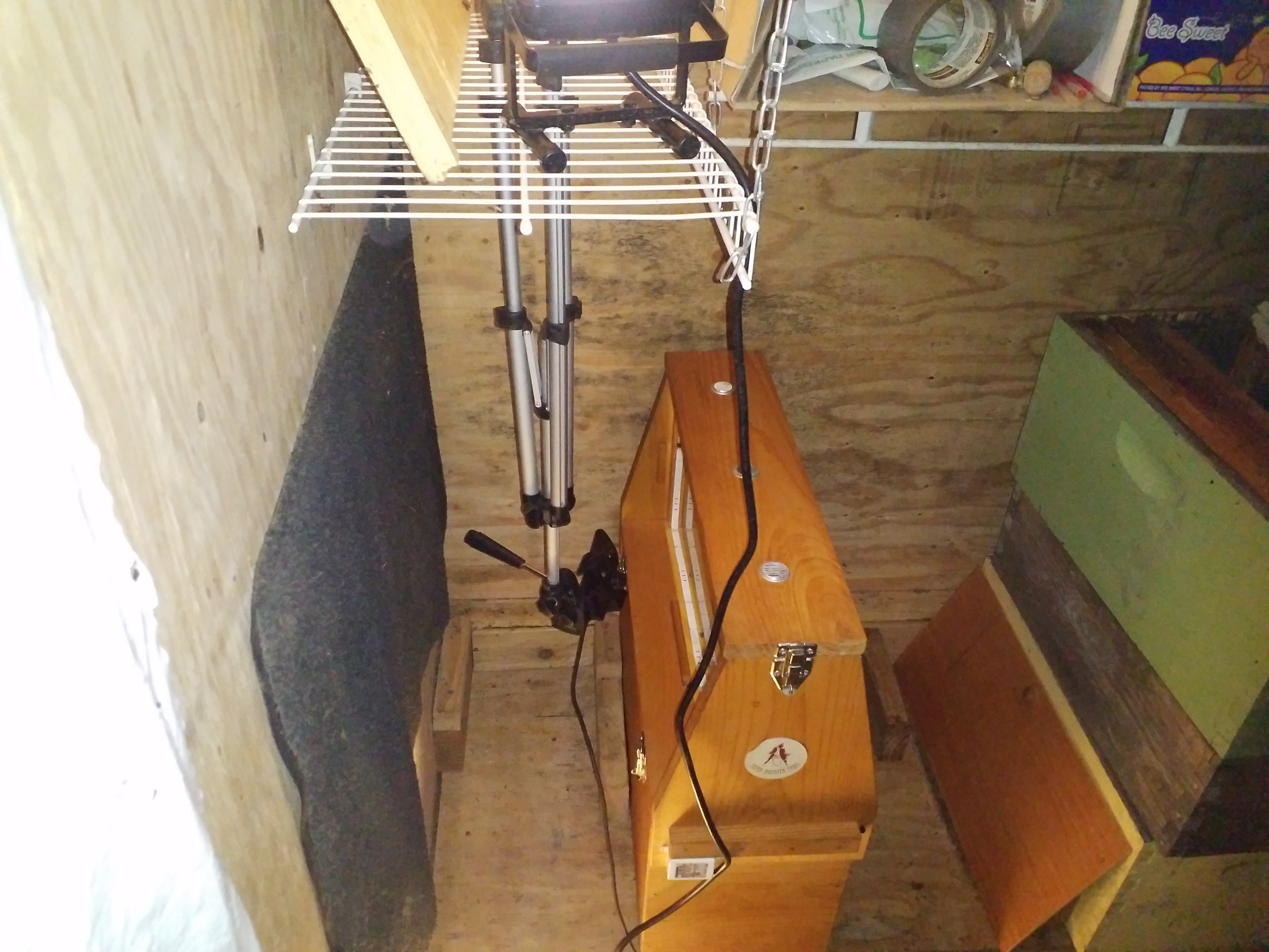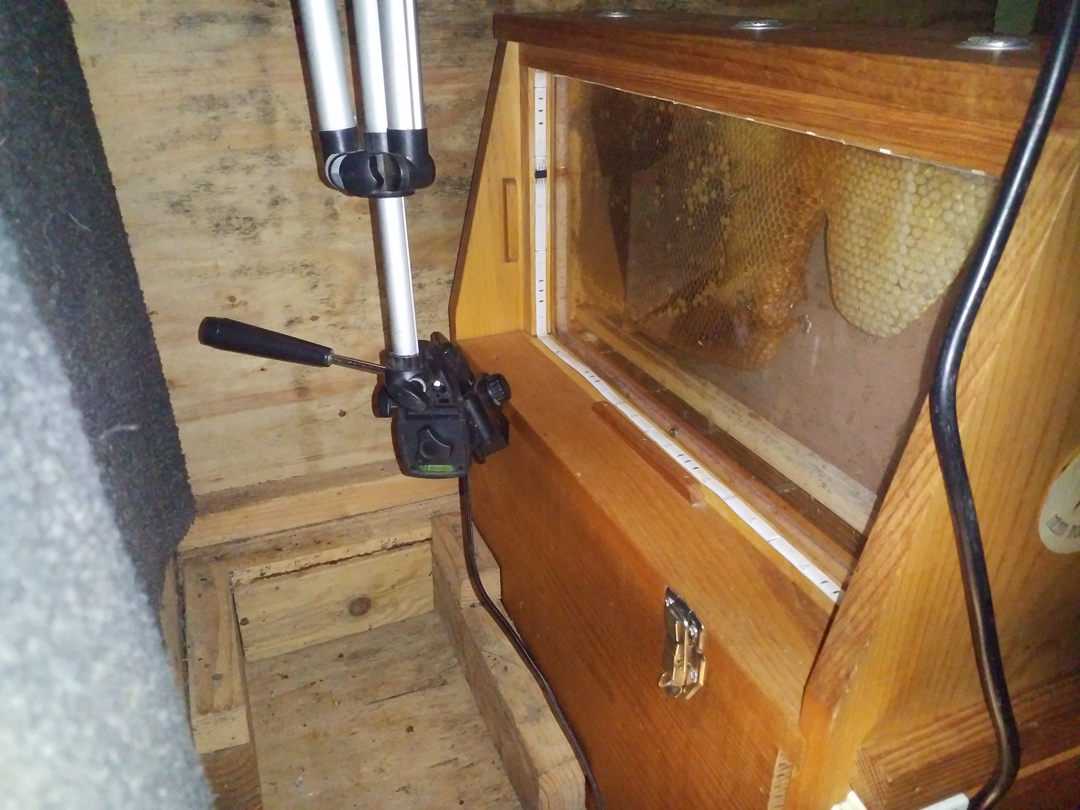 The tripod was too tall. I wanted to get the queen cell from below so you could see her hatch, so I hung the tripod from the shelf above. Those wire shelves have been useful.