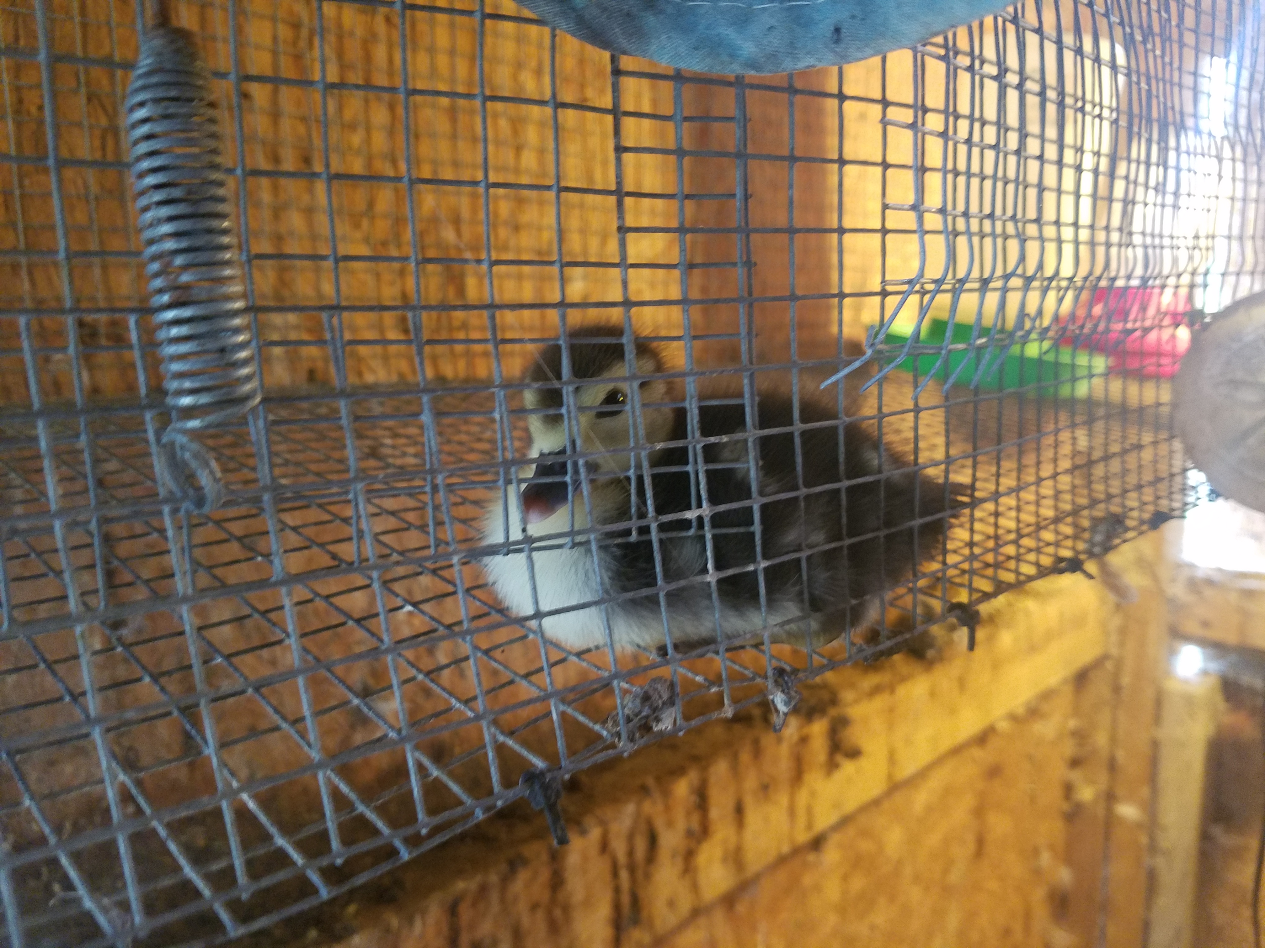 The one muscovy duckling from the first clutch of eggs is living in the hanging cage in the coop.