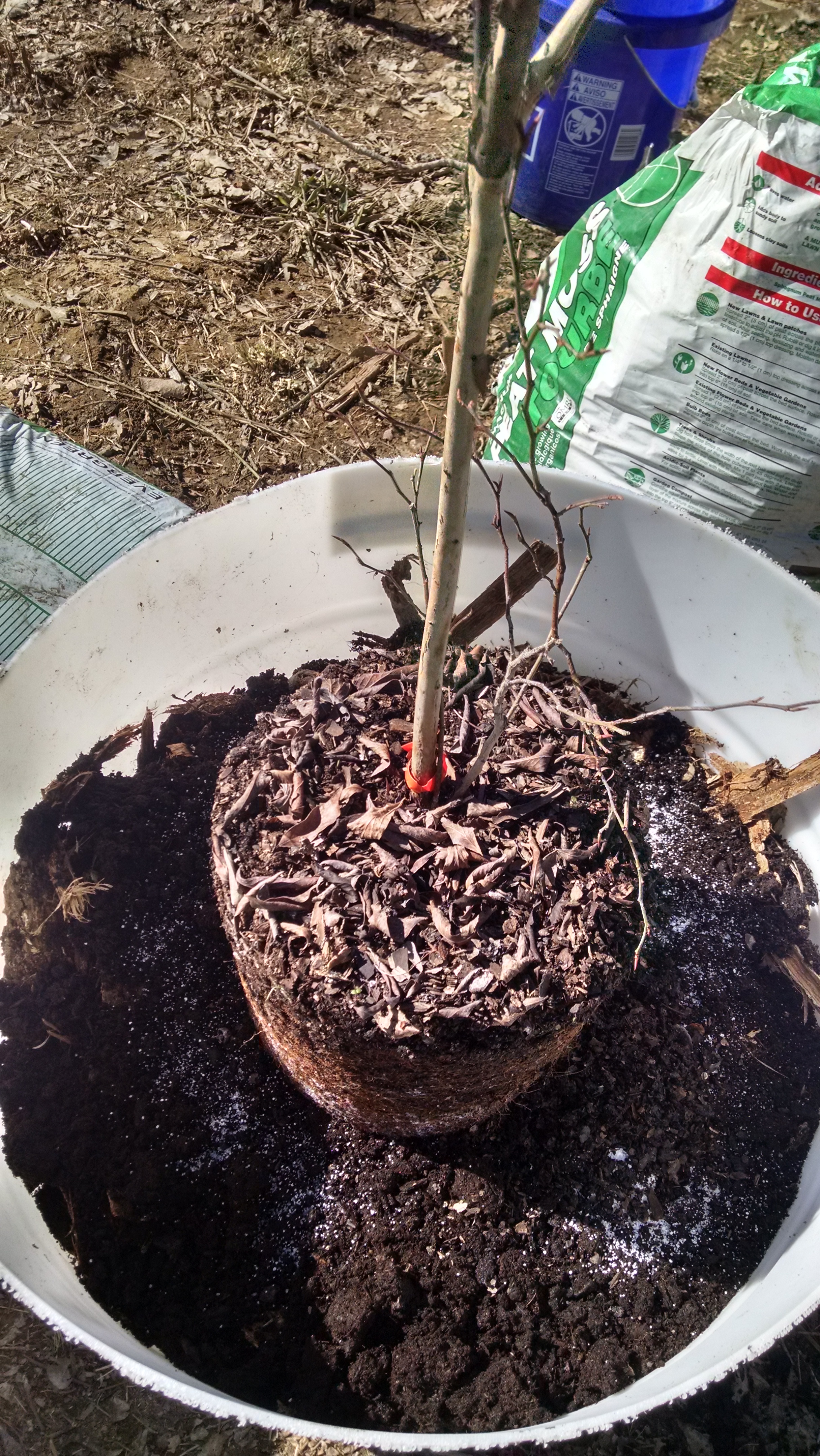 I used bark, wood shavings, wood chips, and saw dust that I got from a neighbor's project. Also pine needles I collected from the woods. Filled the barrels halfway with this mixture and put a layer of peat moss.