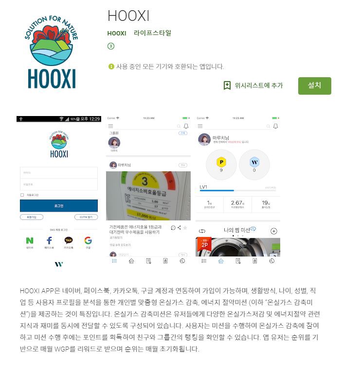 W재단은 온실가스 감축 후시(HOOXI) 캠페인 을 통해서 어플 및 활동들에대한 보상을 WGP를 주게되고, 사용자들은 HOOXI 몰(쇼핑몰) 등에서 결제수단으로 사용 가능한 구조를 만들어서 자연스럽게 탄소발생 및 에너지 소비 감소를 이룩하는 인구의증가를 꾀한다고한다
