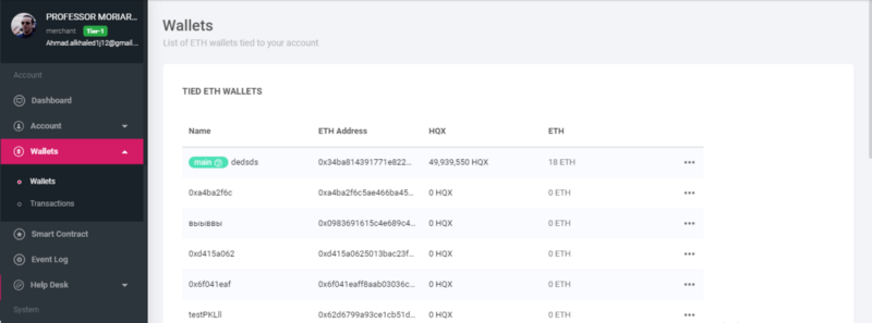 This section allows users to see a list of ETH wallets tied to the account. Here you can see the names of the wallets, their addresses, as well as the balance in ETH and in HOQU Tokens.