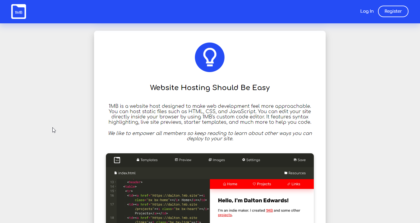 He encontrado un proyecto que me ha resultado de lo más simpático. Se trata de 1mb.site, un servicio que ofrece hosting y subdominio gratuito para tu web siempre que esta no supere 1mb de tamaño.