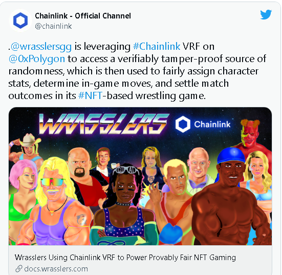 Chainlink VRF Empowers Wrestling-Themed NFT GamesteemCreated with Sketch.ringzero (25)adminin Hot Topics • 5 years ago (edited) Chainlink verified tamper-proof RNG goes live in Wrasslers, allowing its users to randomize the starting statistics of their characters #chainlink #steemit
